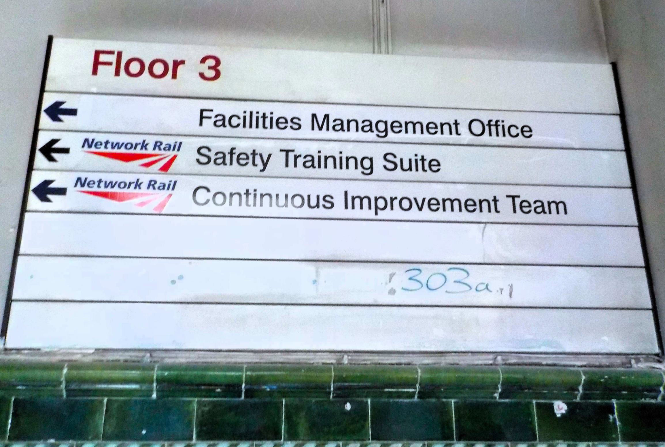 Third Floor: At the top of the stairs, on the wall were old NR signs pointing to various department office suites with names like Facilities Management, Safety Training Suite, Continuous Improvement Team etc. Like the previous floors, the first room off to the right of the stairs didn't contain very much, apart from a few skylights from the roof. Due to their condition, they had been deconstructed and lay on the floor to be restored and reinstalled. A guide said they were like a giant Meccano kit of bits. There were several more rooms off to the left as we went down the corridor heading towards P3, some still had job titles on the doors. One such was the Corporate Office. Some of the rooms at the far end still had historic wallpaper hidden until the suspended ceilings had been removed recently, Liz was told that this part of the building was once used as staff accommodation. Unlike the other floors, on this level some of the rooms still had safety posters hanging on the walls. The Lancashire & Yorkshire Railway Signalling School model railway was in one of the larger rooms for over 80 years, being used by generations of signalling trainees until its removal to the NRM in 1995. Groups of enthusiasts were allowed visits at times.