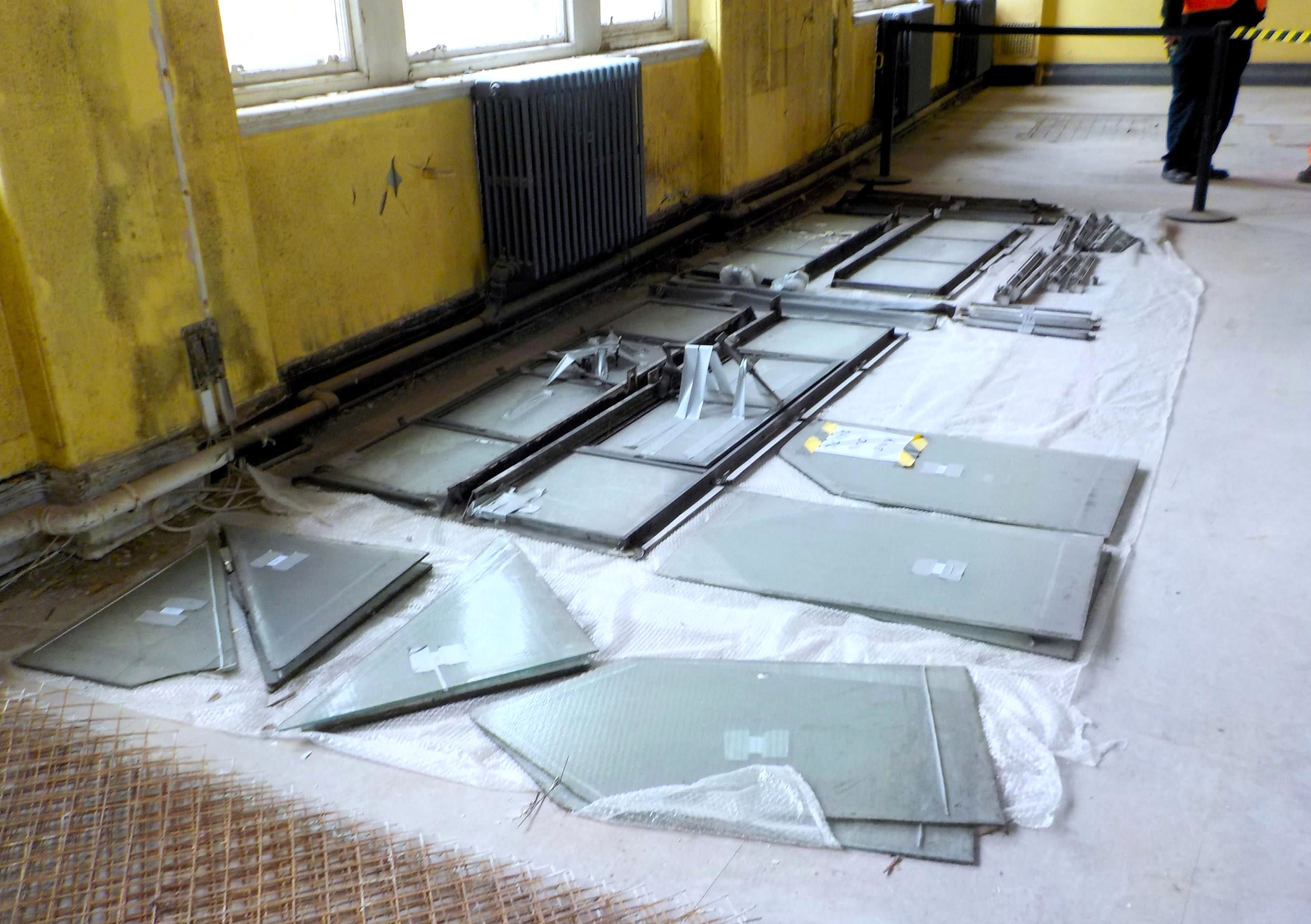 Dismantled skylight parts at the Shudehill end of the third floor.