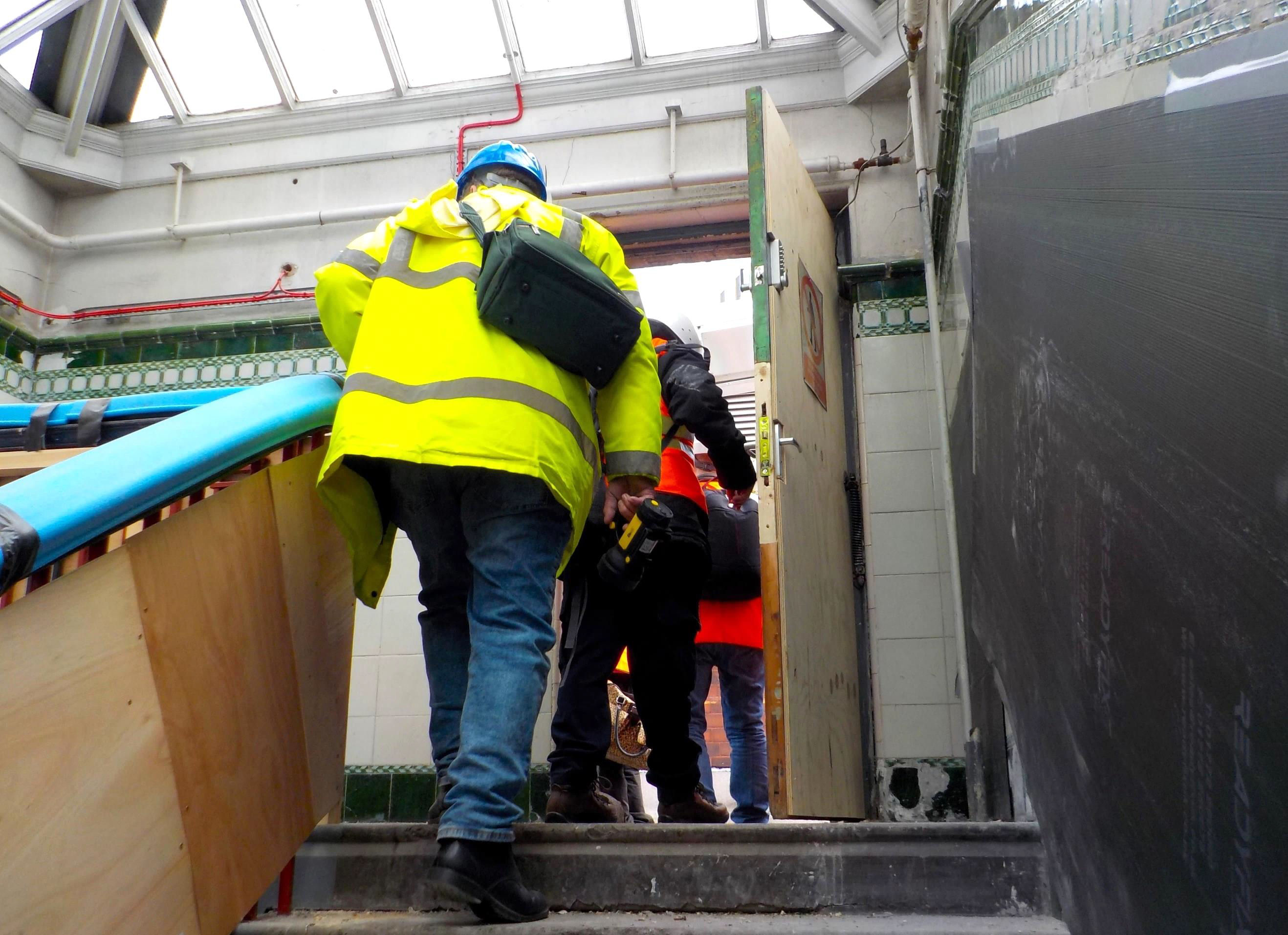 The group walked towards the Shudehill end of the station, turned off right through an exit arch and queued up to gain access through a wooden door in the wall. We proceeded up the stairs to the first floor and convened in the first room off the stairs on the right. This room overlooks Todd Street and Corporation Street outside, in the direction of Shudehill Metrolink stop. Once all had gathered inside, participants received another short safety briefing about what to expect on the floors ahead, what to be careful of and to watch out for. Apart from that, we were free to explore and ask questions at our leisure. The staircase we used to reach each floor featured some fantastic period tiles on its walls.