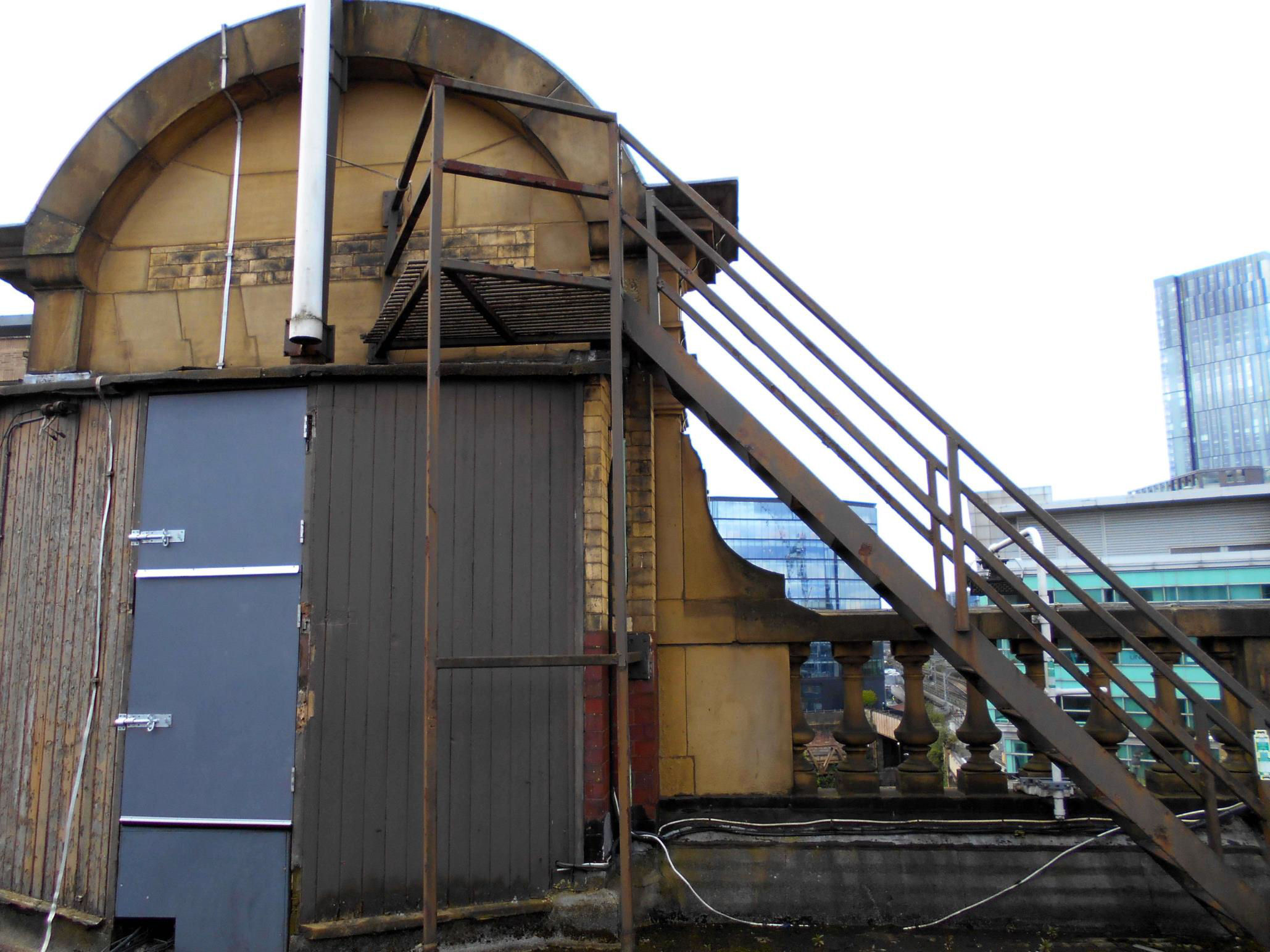 Second Floor: Again, the first main room we entered was off to the right of the stairs at the Shudehill end. As on the floor below, it was just one massive open room except for, on the station concourse side of the building, a fire exit door part way up the wall although the steps up to it had been removed. The emergency staircase was still in place outside. We learnt that the building had been known as 'The Battleship' by those who worked here, on account of the massive exposed riveted steel joists.