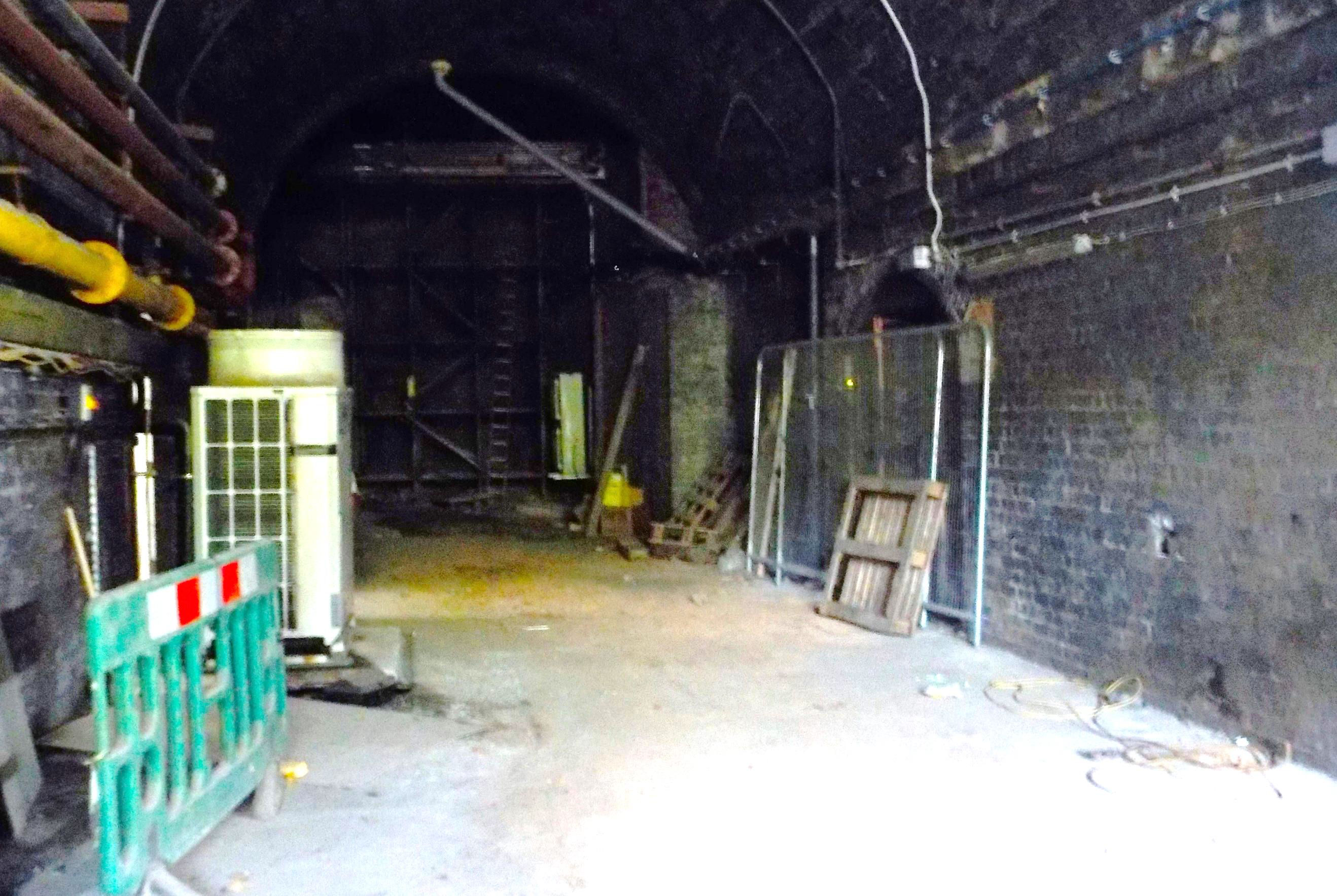 Walkers Croft Area: Then, it was along to the Walkers Croft area, passing a number of what appeared to be former livestock pens. Part way down a passage, one of the NR guides stopped us to open a small trap door on the left and we took it in turns to view and hear the River Irk deep below. There was ornate lettering above the arch at the end of this bridge although it was partly hidden and we couldn't make out the full names. At the end, the corridor opened up into a larger tunnel, Walkers Croft, which was an original street alongside the River Irk before the station was built. Here many years ago, the front end of Pacer 142059 used to lean against a wall. A tour participant remembered this and kindly showed us where the cab used to be, now sadly long gone. There were various rooms here off the main tunnel.