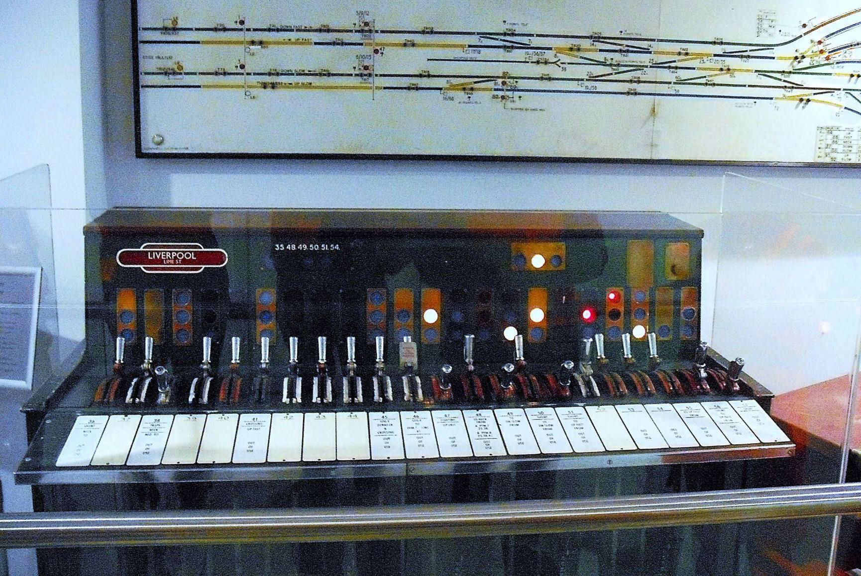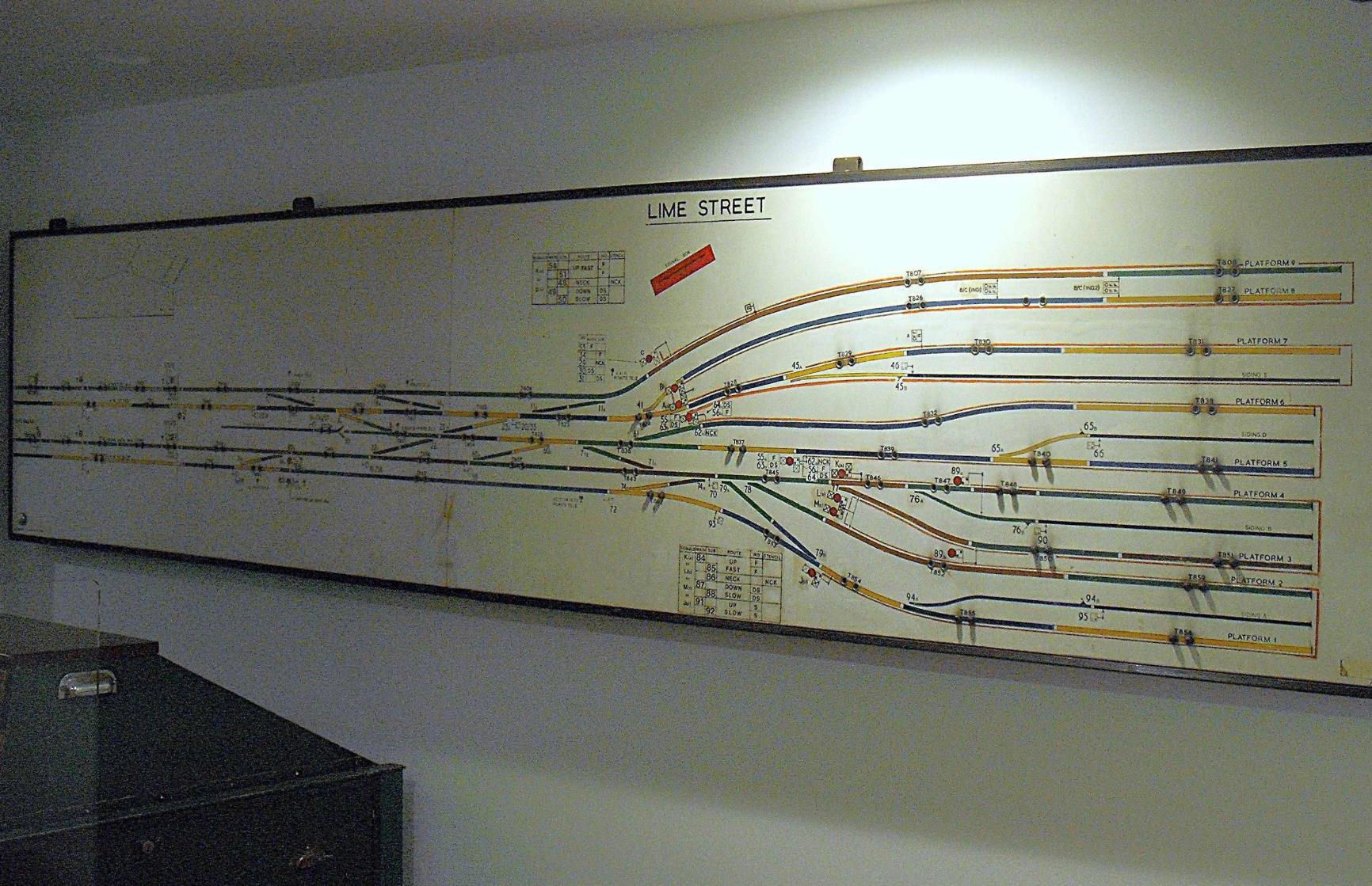 At the upstairs Standard Class waiting area 'mini-Museum' - taken through glass - the former Lime Street signal box diagram on public display.