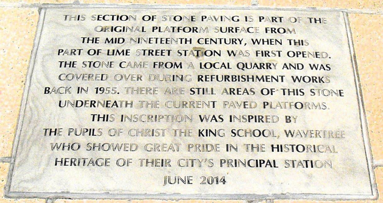 The inscription on an original paving stone from the mid-19th Century that was covered over in 1955 during platform refurbishment.