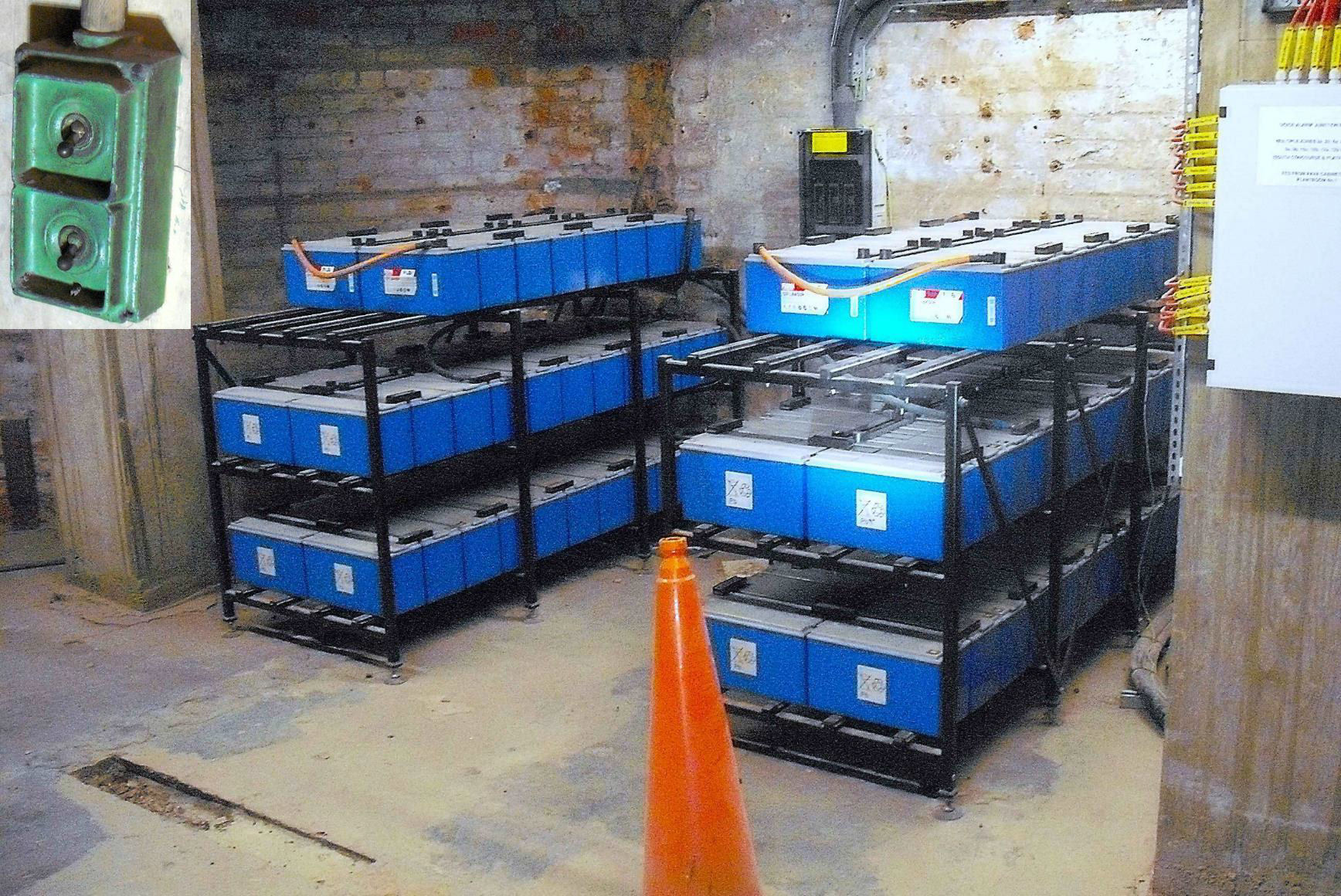 Some standby emergency batteries. INSET Old light switches.