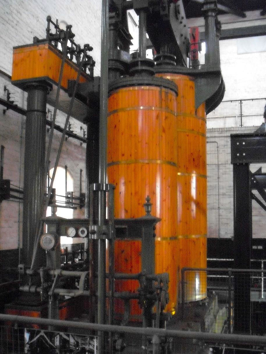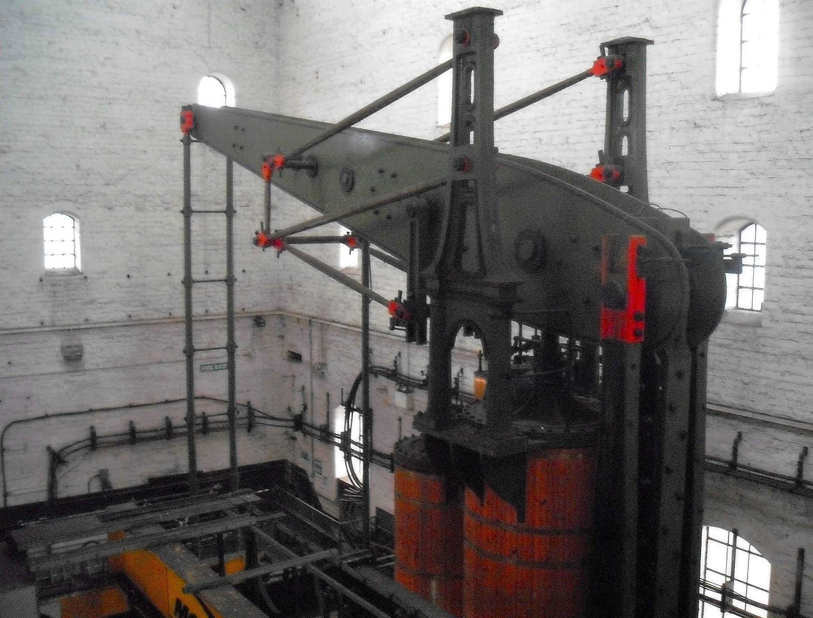 The 'grasshopper' steam pumping engine high-pressure and low-pressure pistons and the pump rod.