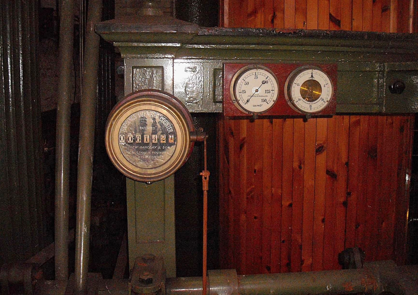 The gauges on the 'grasshopper' steam pumping engine.