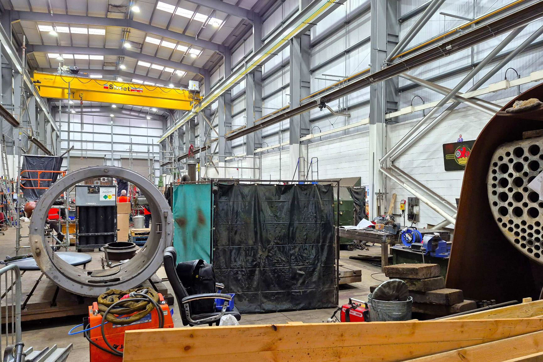 General view of the modern, spacious purpose-built Boiler Shop with its overhead crane (running on extremely broad gauge track).