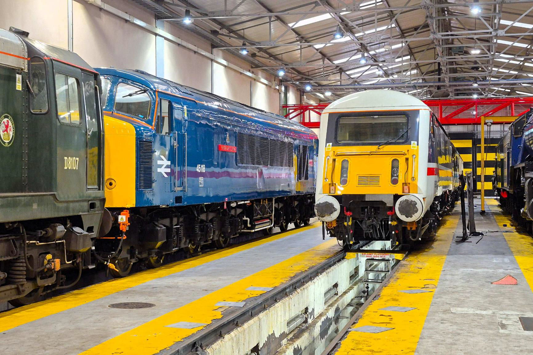The main running shed was the original Crewe Diesel Depot, here with D8107 (20107), Peak 45118 'The Royal Artilleryman' and 'The Badger' 89001.