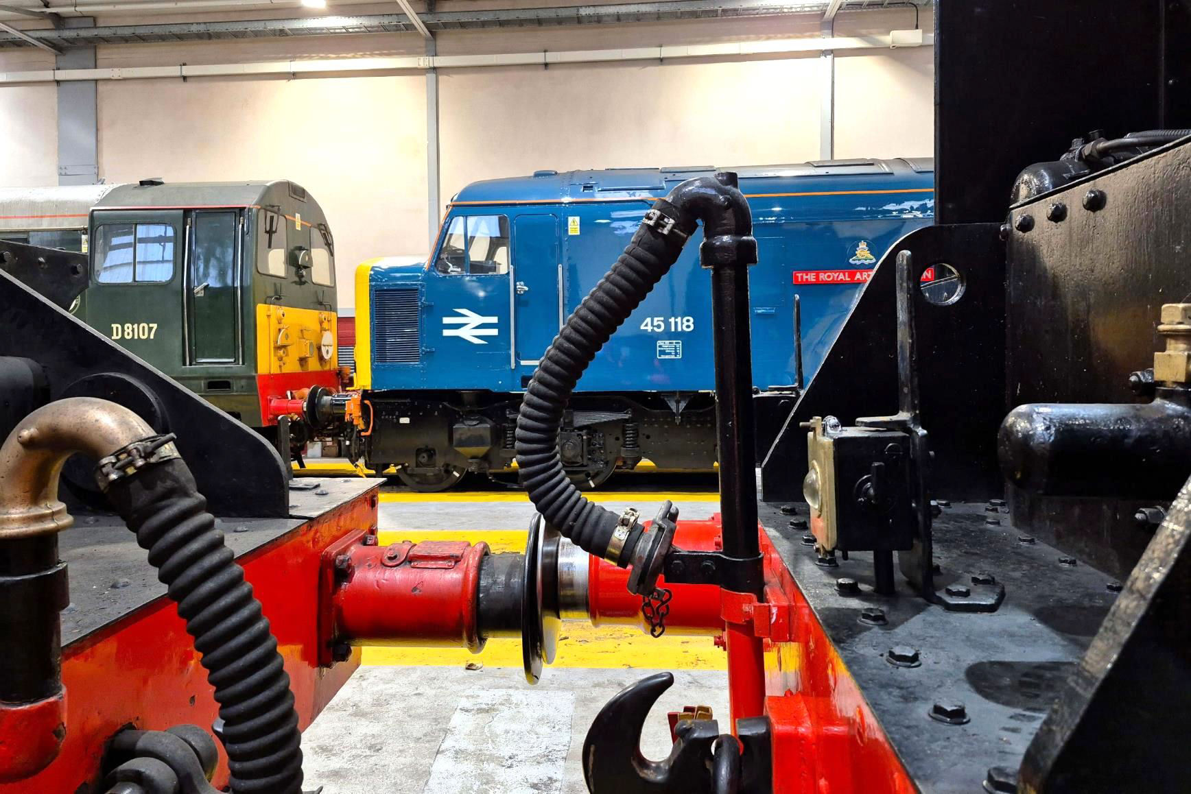 Leaving the Boiler Shop, we entered the original Diesel Depot building, which now has a dividing wall separating the main running shed from the workshop space. A high-level gantry bridge connects both sides of the building, affording excellent views of the rolling stock and the work being undertaken in the workshop / fitting shop. On entering the building, the first thing we saw was 46100 'Royal Scot' looking pristine. Nick told us that from 3rd Dec she would be out of ticket but was making one more mainline run on 28 Nov. After that, she will likely be put into storage and eventual display at the LS facility at the former Hornby factory (owned by Jeremy Hosking) in Margate, while she awaits her turn in the queue for major overhaul. Next 60532 'Blue Peter' looked stunning in blue livery. Recently returned to service after a £5M plus rebuild from the frames up, she is a testament to the passion and commitment of the Chairman.