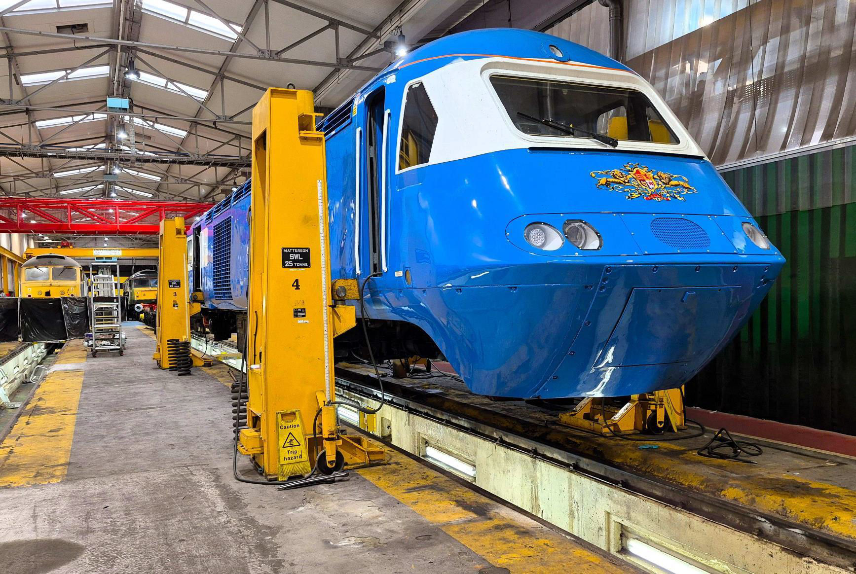 The newly painted 43058 'Loch Eil' HST power car sits on jacks in the workshop waiting for its bogies (seen foreground right in the previous photo).