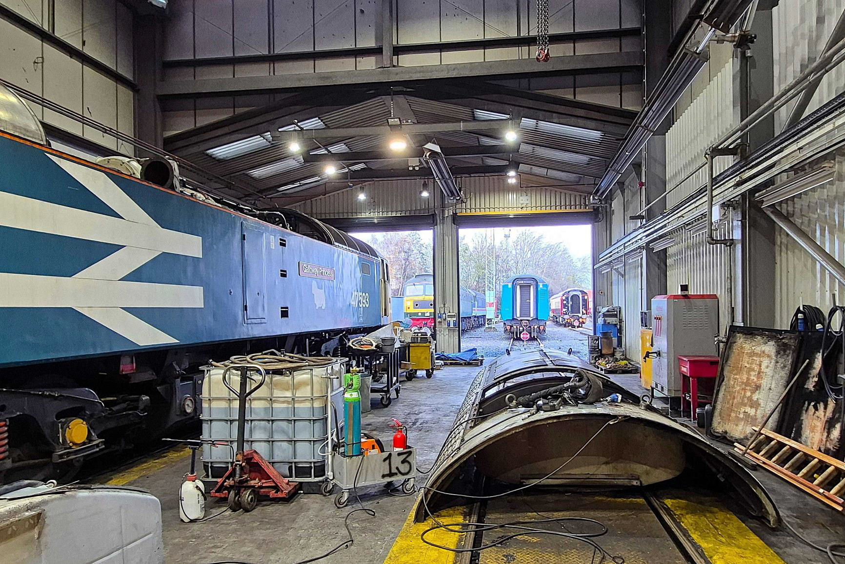 47953 'Galloway Princess' is in the heavy lifting shed with its roof on the ground beside it.