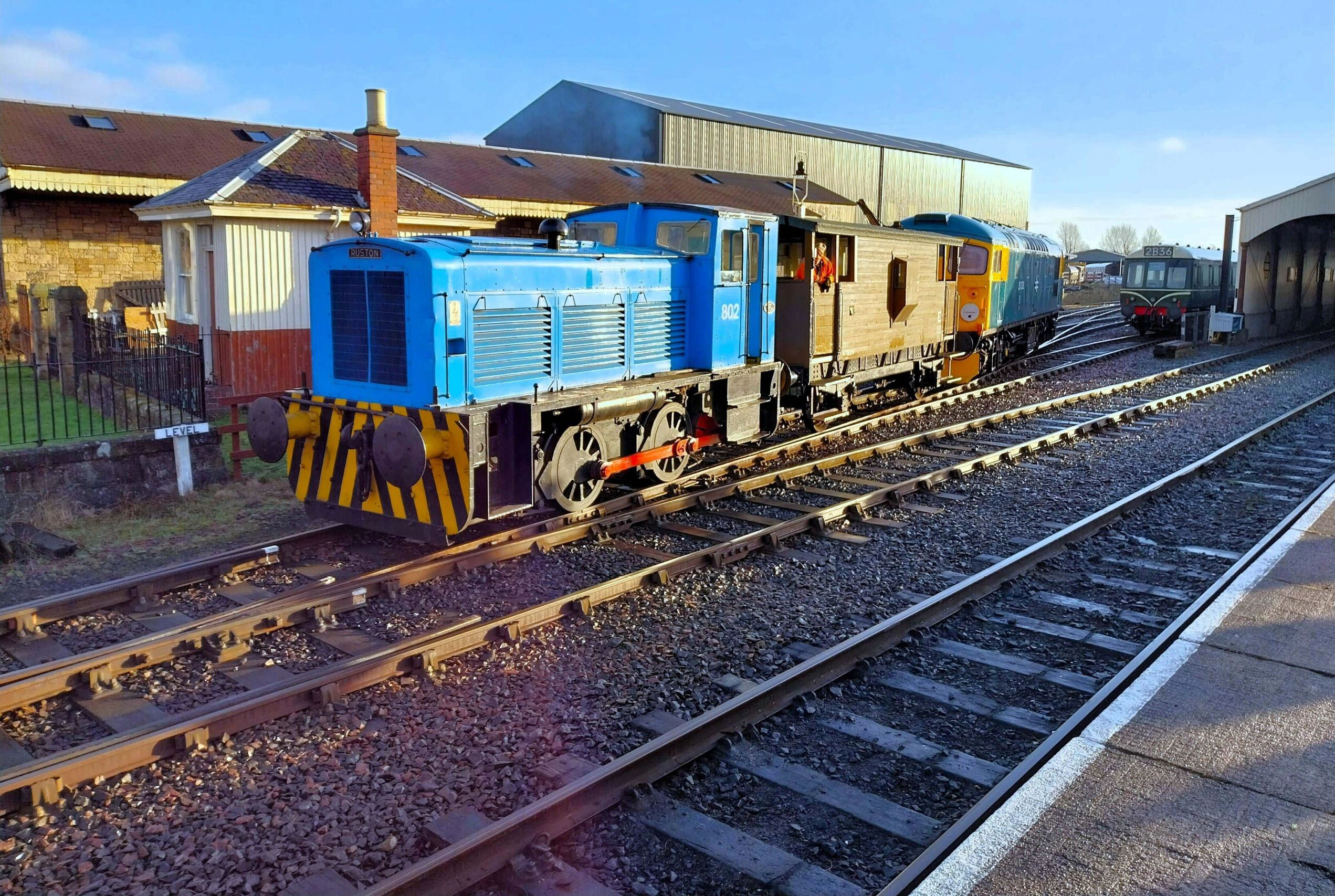 Our traction for the day was somewhat of a mixed bag with mainline loco 26038 fresh from a repaint in BR Blue and named 'Tom Clift 1954-2012', looking splendid in the spring sunshine. Also used for our charter around the yard at Bo'ness were two rare birds for passenger haulage: P6687, an 0-4-0DE Built by Ruston 312984 in 1951, and another Ruston, numbered 802 an 0-4-0DH 457299 of 1962 painted blue.