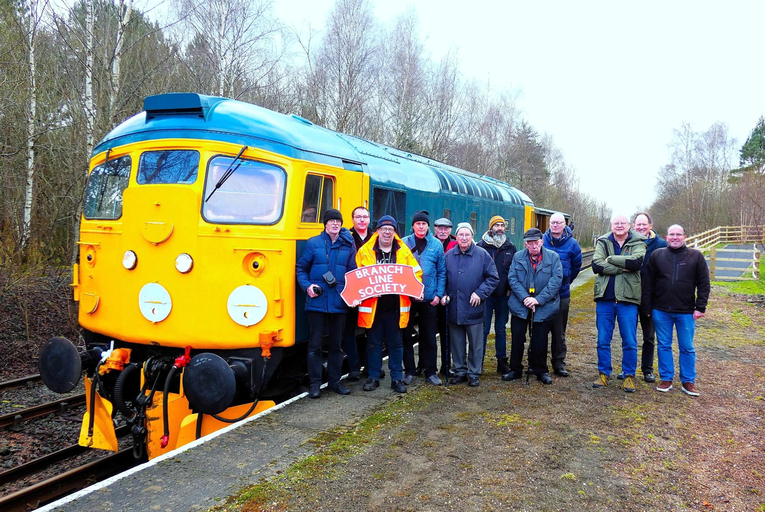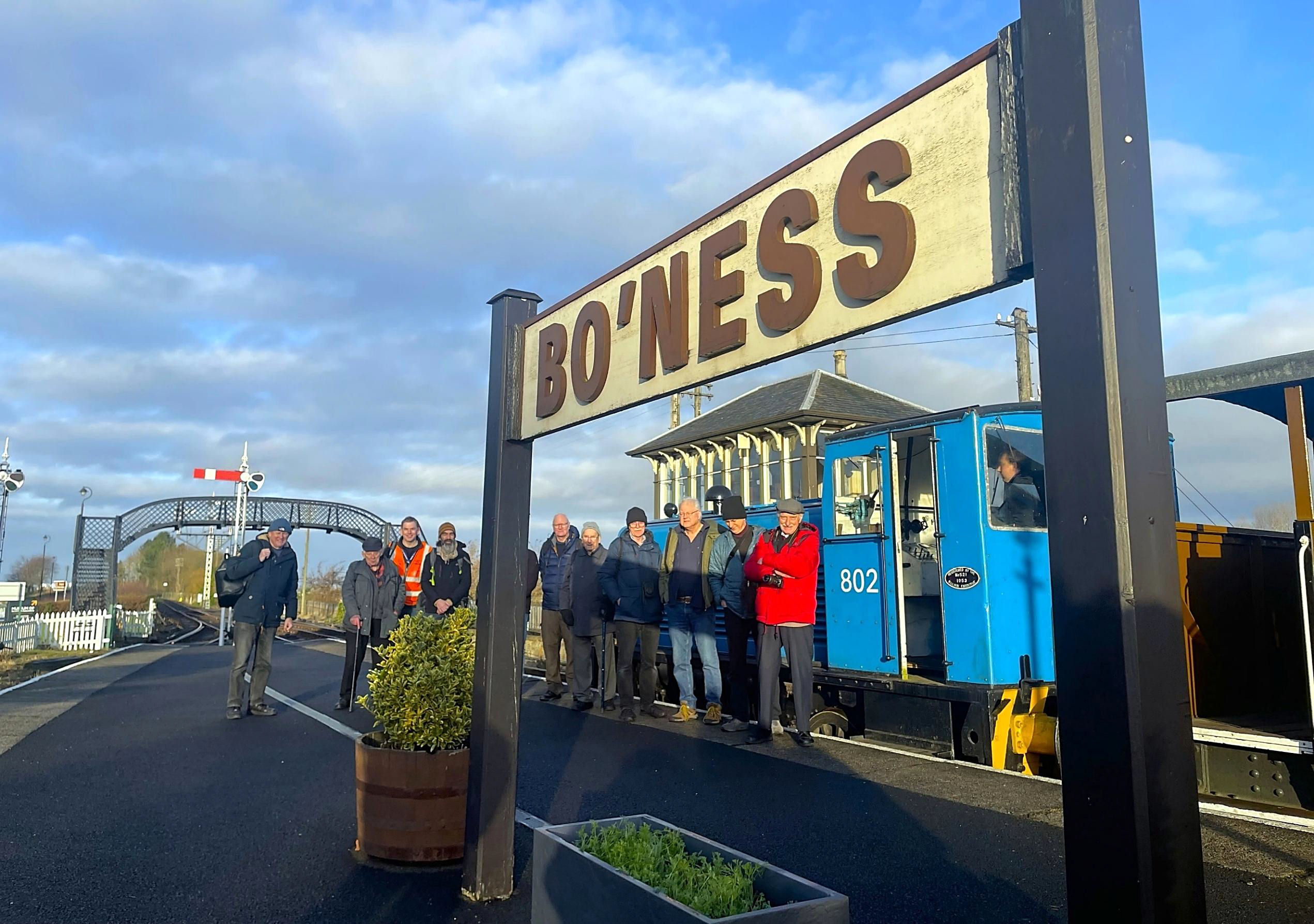 The Saturday morning group at Kinneil Halt on the return from Manuel; our Fixtures Sec, Kev Adlam, holds the headboard.