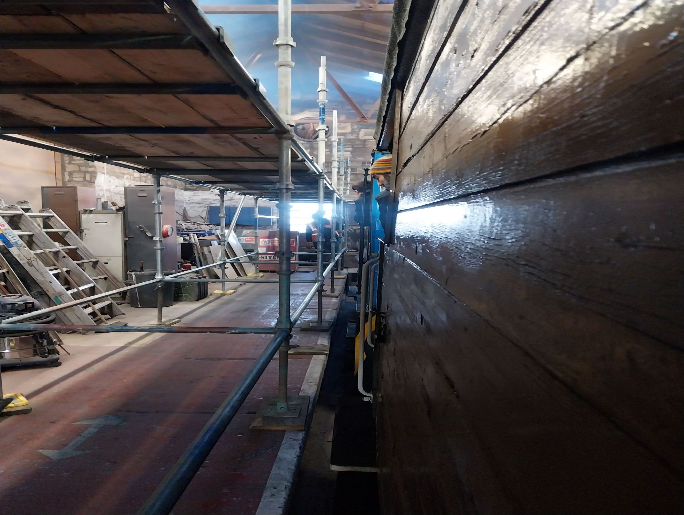 The tour covered several lines at Bo'ness, including the station run round loop to the buffers, the coal line to buffers (we reached quite a few buffers) and signal box headshunt. The highlight was not only a traversal up to the buffers on the turntable road behind the signal box but also a very rare move into the goods shed. This is unlikely to be repeated as it is used for carriage works and normally the line is blocked. Inside the building was a scaffold frame, so the train crept to the very far end with minimum clearance at less than walking pace, the whole train, when it stopped, was totally encased in scaffolding.