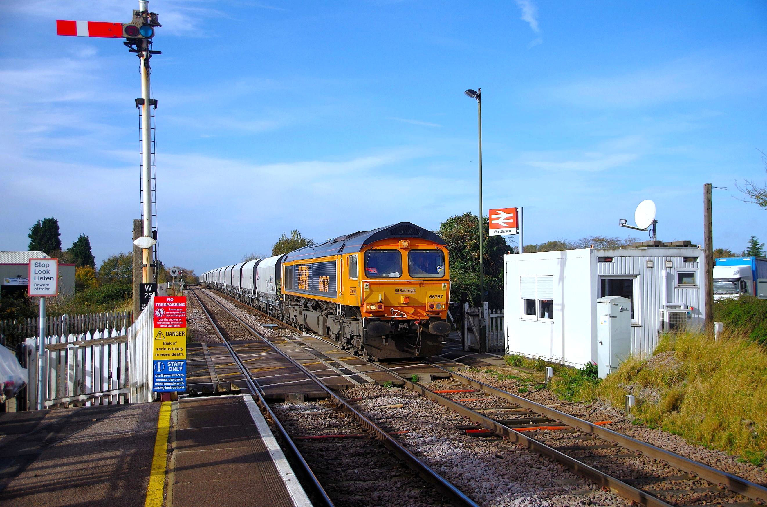 An aggregates train at Whittlesea Manually Controlled Level Crossing approaching the station, looking towards Peterborough.