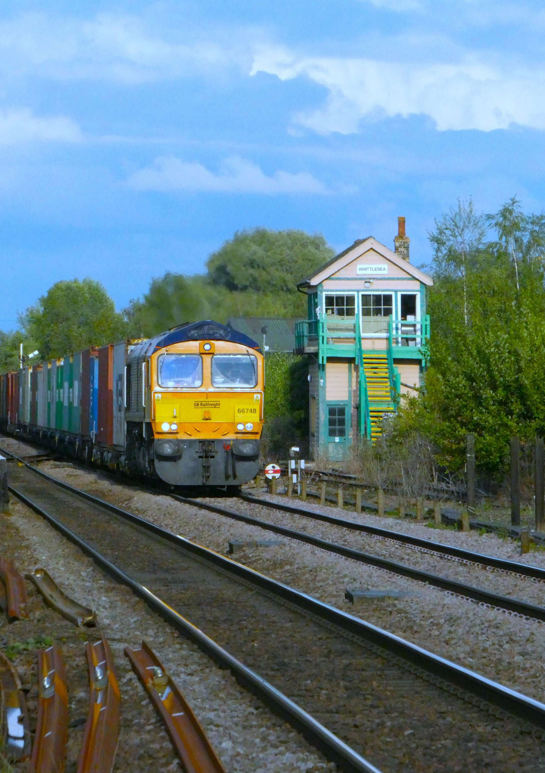 A liner train (15.38 Felixstowe South to Doncaster iPort passing Whittlesea signal box looking towards March.