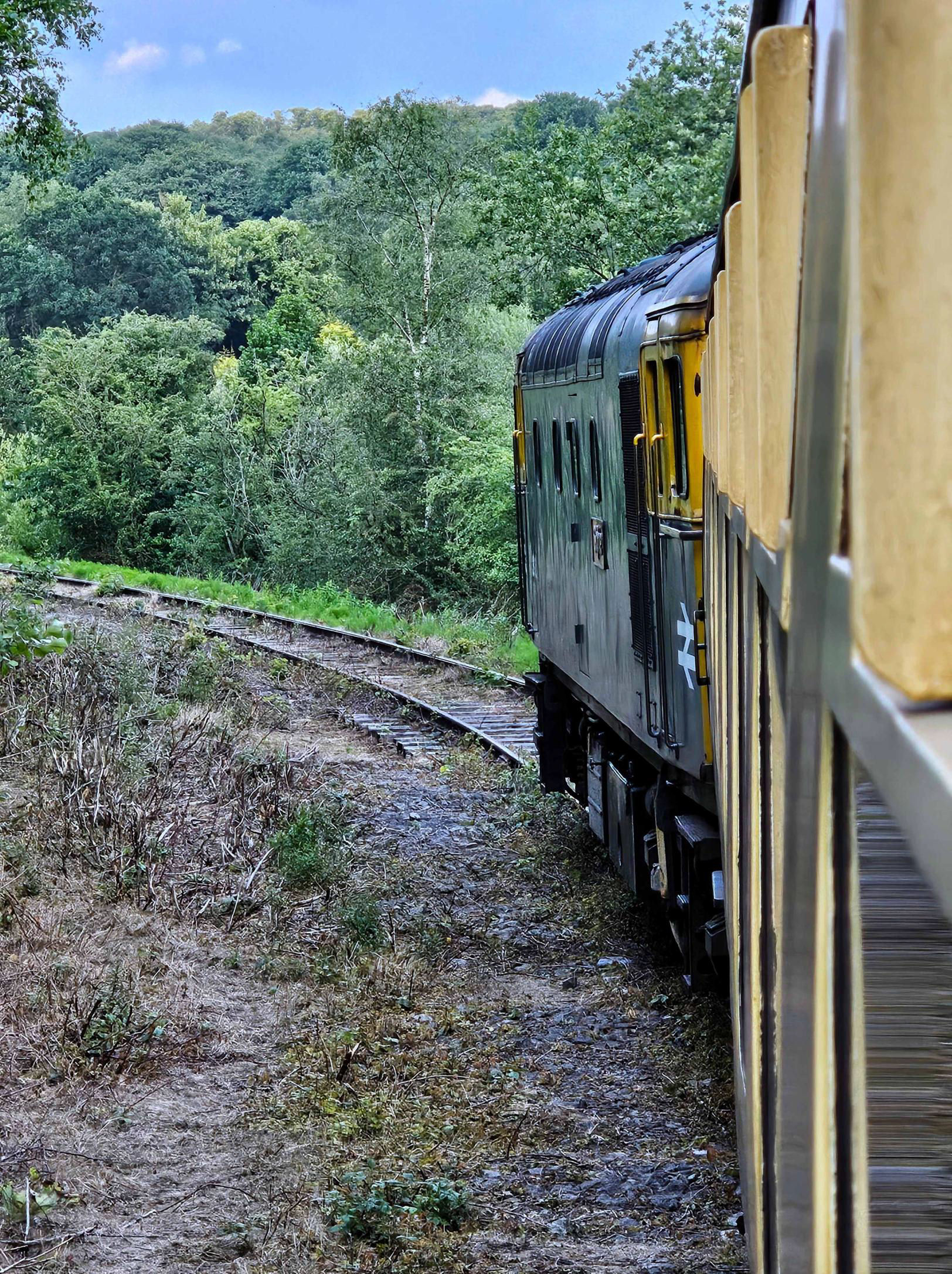 Leaving at 18.28, the Class 33 took us south in the direction of Uttoxeter, a section not used by passenger trains now, past two dead end sidings full of stock on the left, best described as 'waiting restoration' then a little further along the single line as far as we could before further stock stopped us. (This updates TRACKmaps 4 p26B 2022.) The steam locomotive then took us north through Kingsley & Froghall loop. Only our departure platform is normally used by passengers here, so this was further rare track.