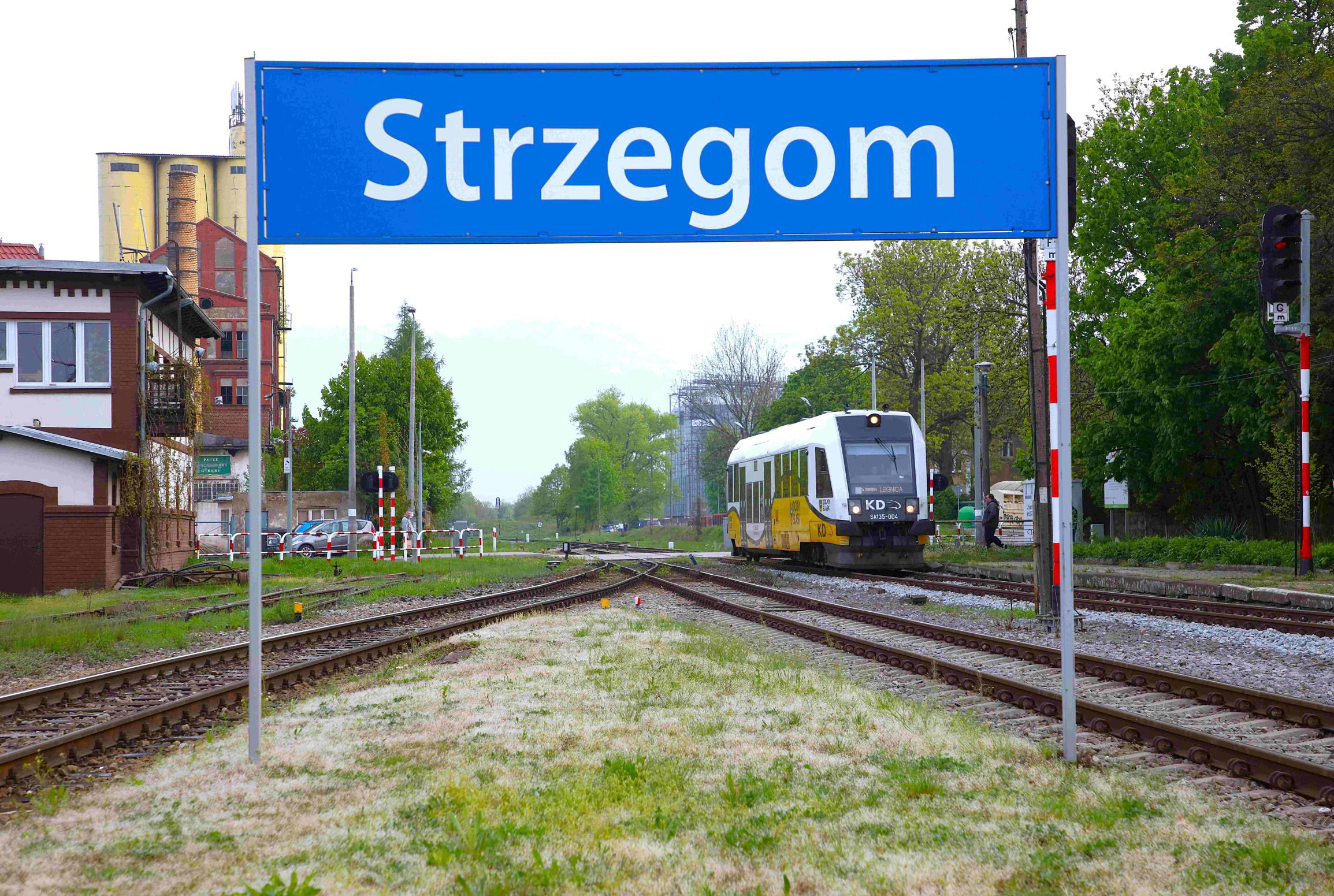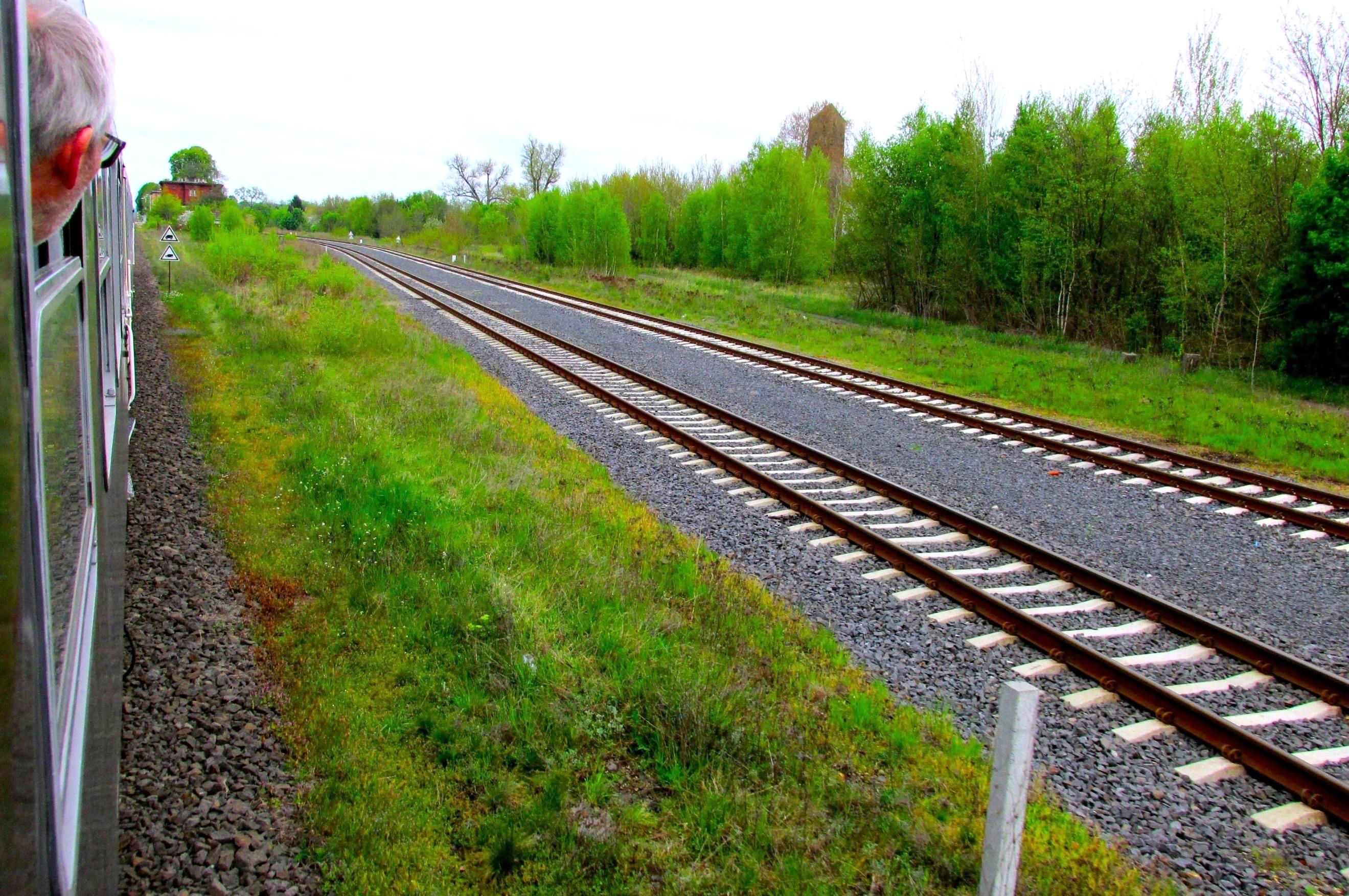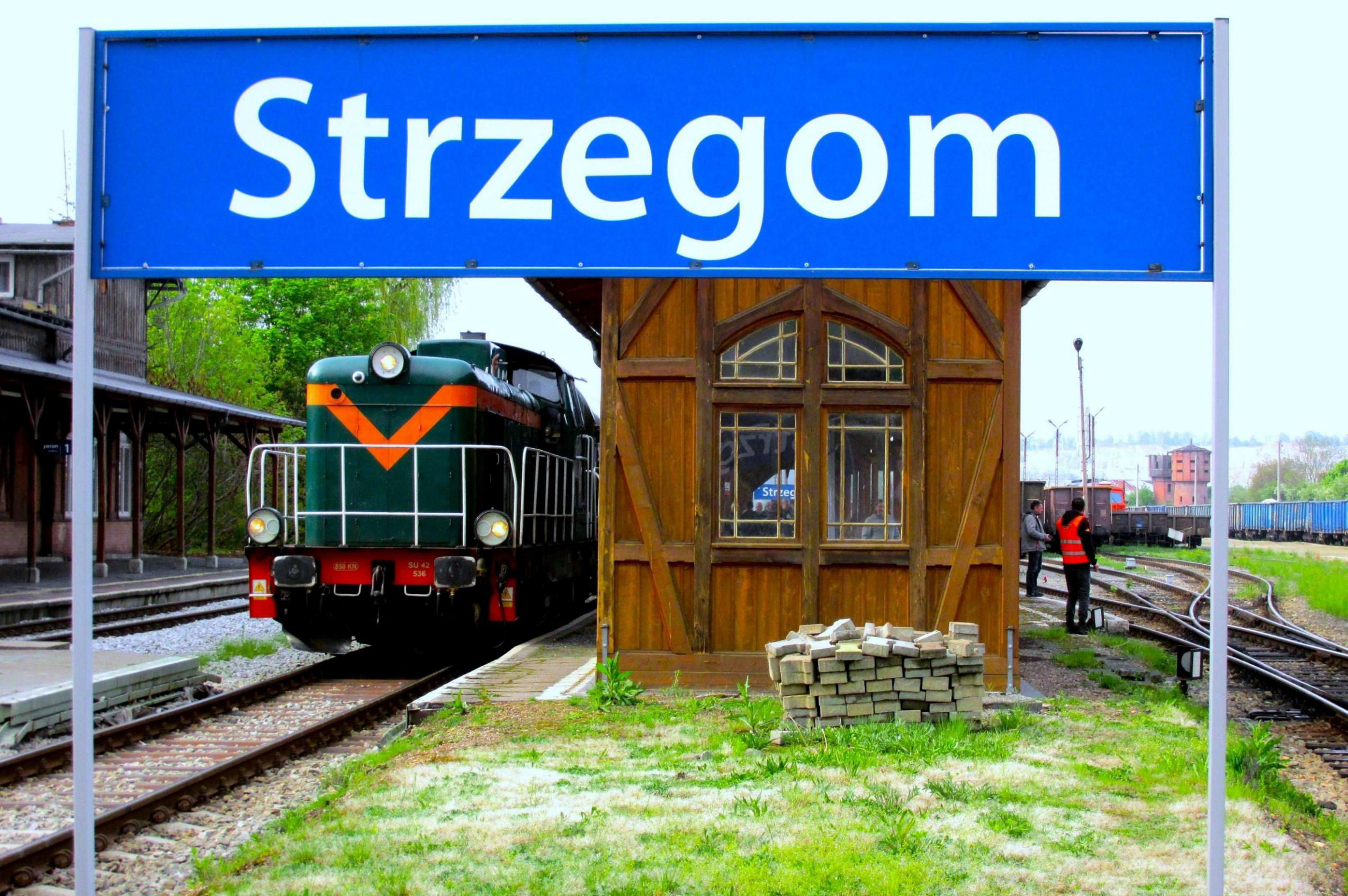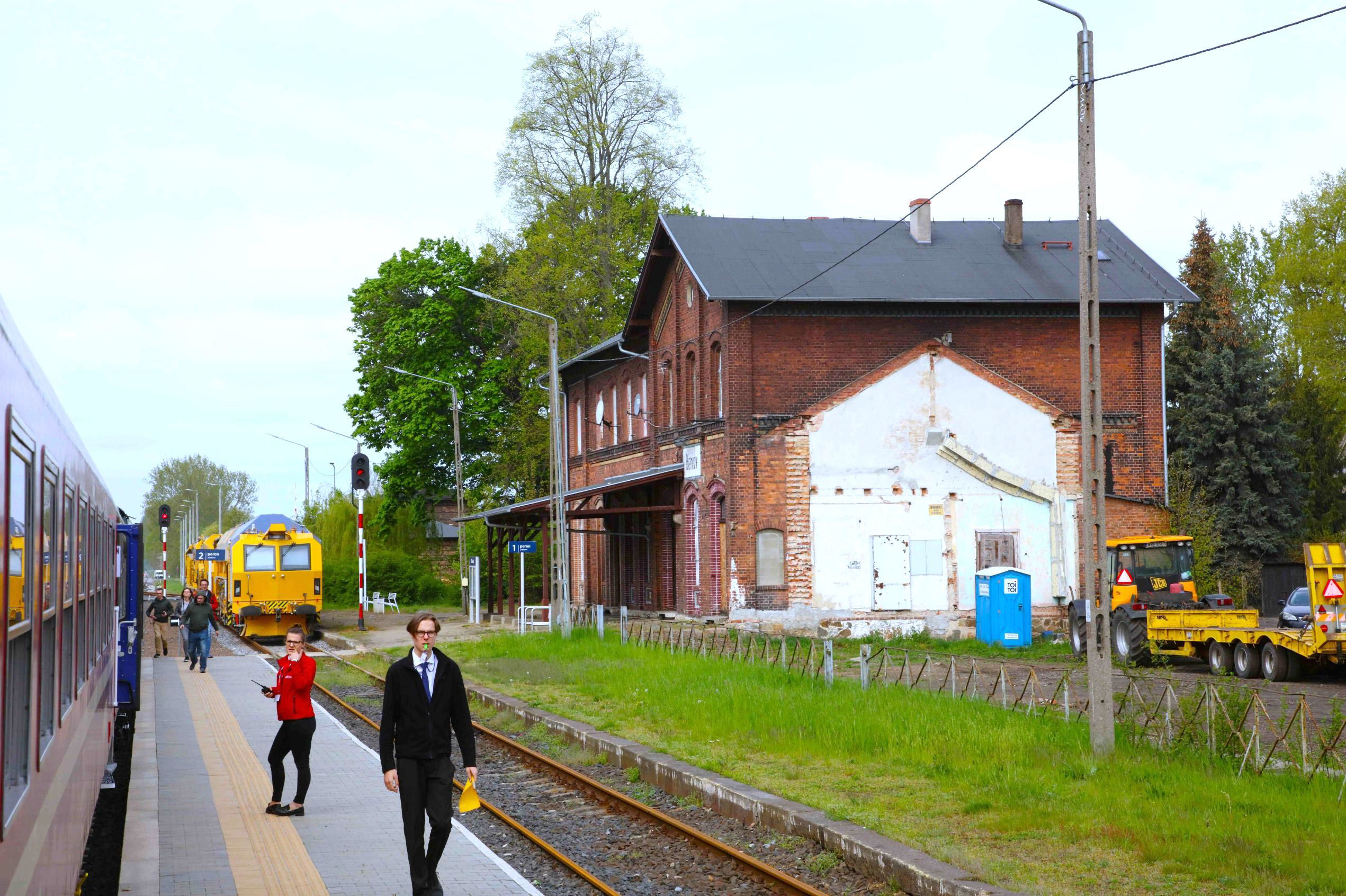 There were many photographers along this line, no doubt obtaining some rare shots. It was notable that the signallers leant out of their boxes (especially staffed just for our passing!), taking photos and videos typically on their phones as well. We made a photo stop at Niegosławice, whose painted name on the end wall could just be made out. It's a typically intact but weed strewn abandoned station in the Polish countryside, which always makes a photo of a passenger train stopped in the greenery, the rails ahead thick with rust, all the more incongruous and unexpected on Polish Railways. Google reveals it has a population of 893 and its claim to fame is a one Gunter Blobel born here in 1934. He won a Nobel Prize in medicine in 1999 regarding protein signals in cells but, irrespective, he surely did the track before WWII! Respect! Next was Szprotawa, a much larger place of some eleven thousand citizens, which clearly has a much more modern station building, albeit in the traditionally weed strewn surroundings.