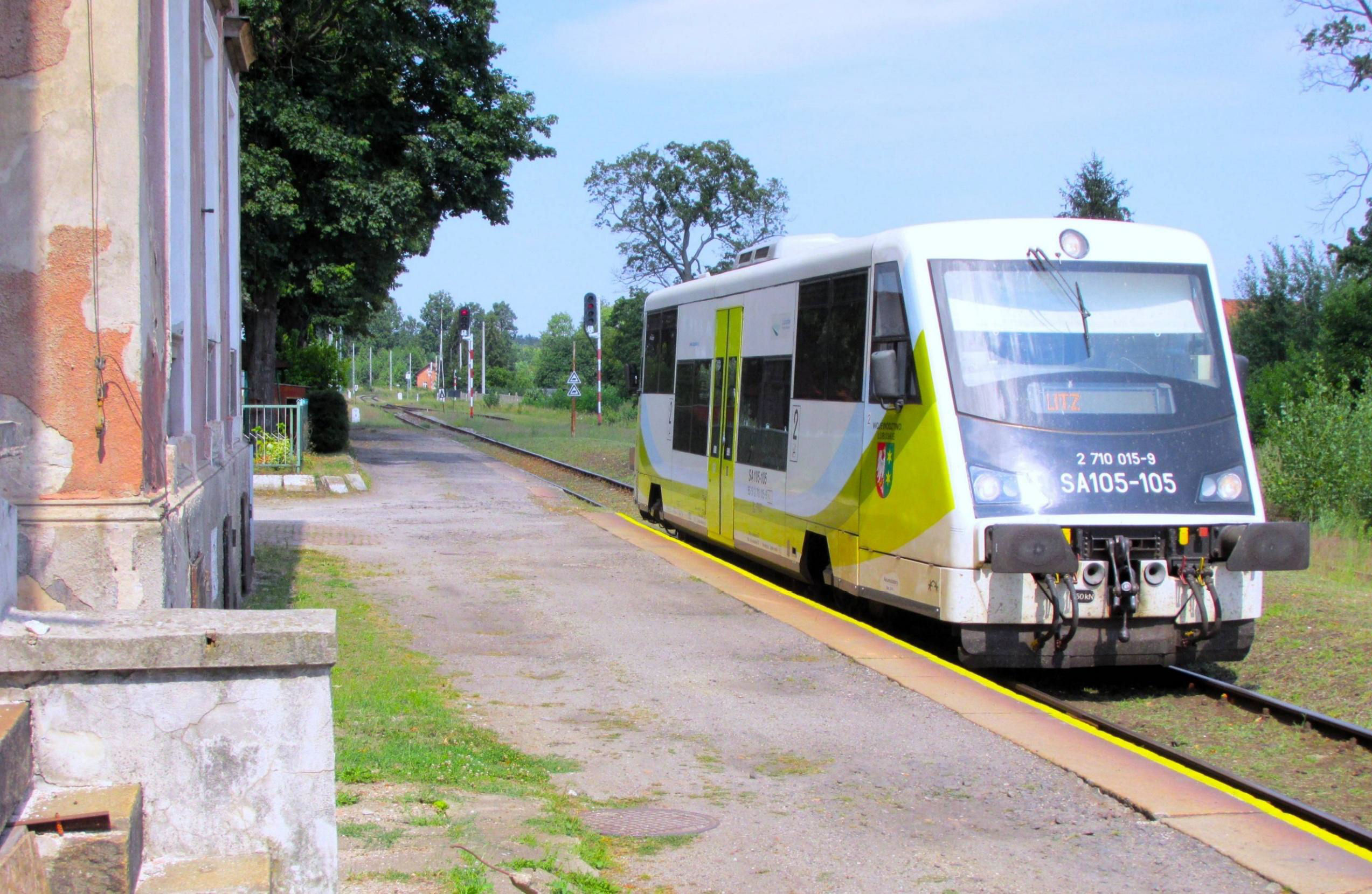 Back nearly five years to 13 Aug 2020 and railbus SA105-105 for Łódź (Litz in German) is awaiting a path south at Jankowa Żagańska. You would have difficulty NOT standing behind the yellow line at this station!