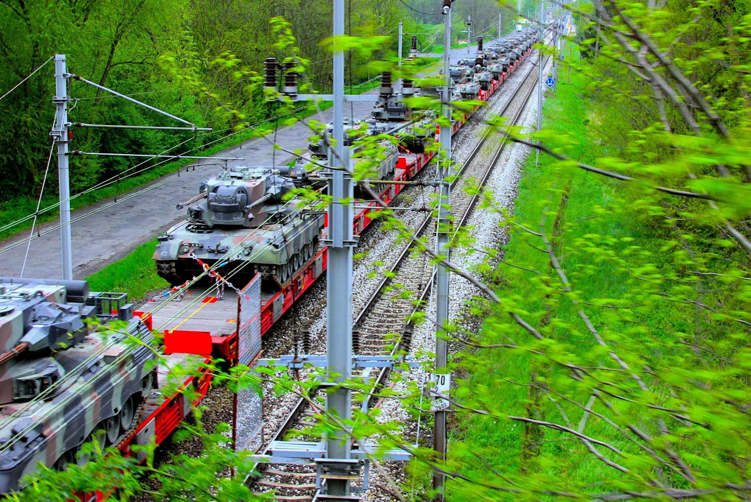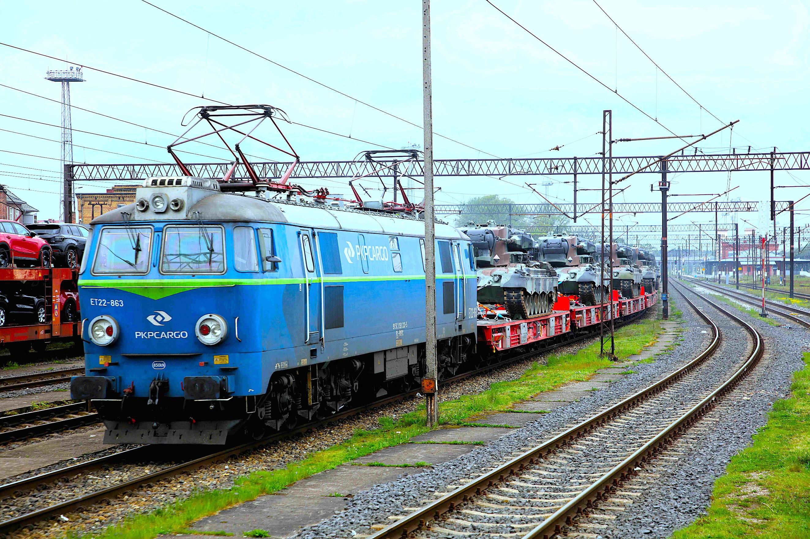 A train load of Flakpanzer Gepards (anti-aircraft gun tanks) for Ukraine at Węgliniec.