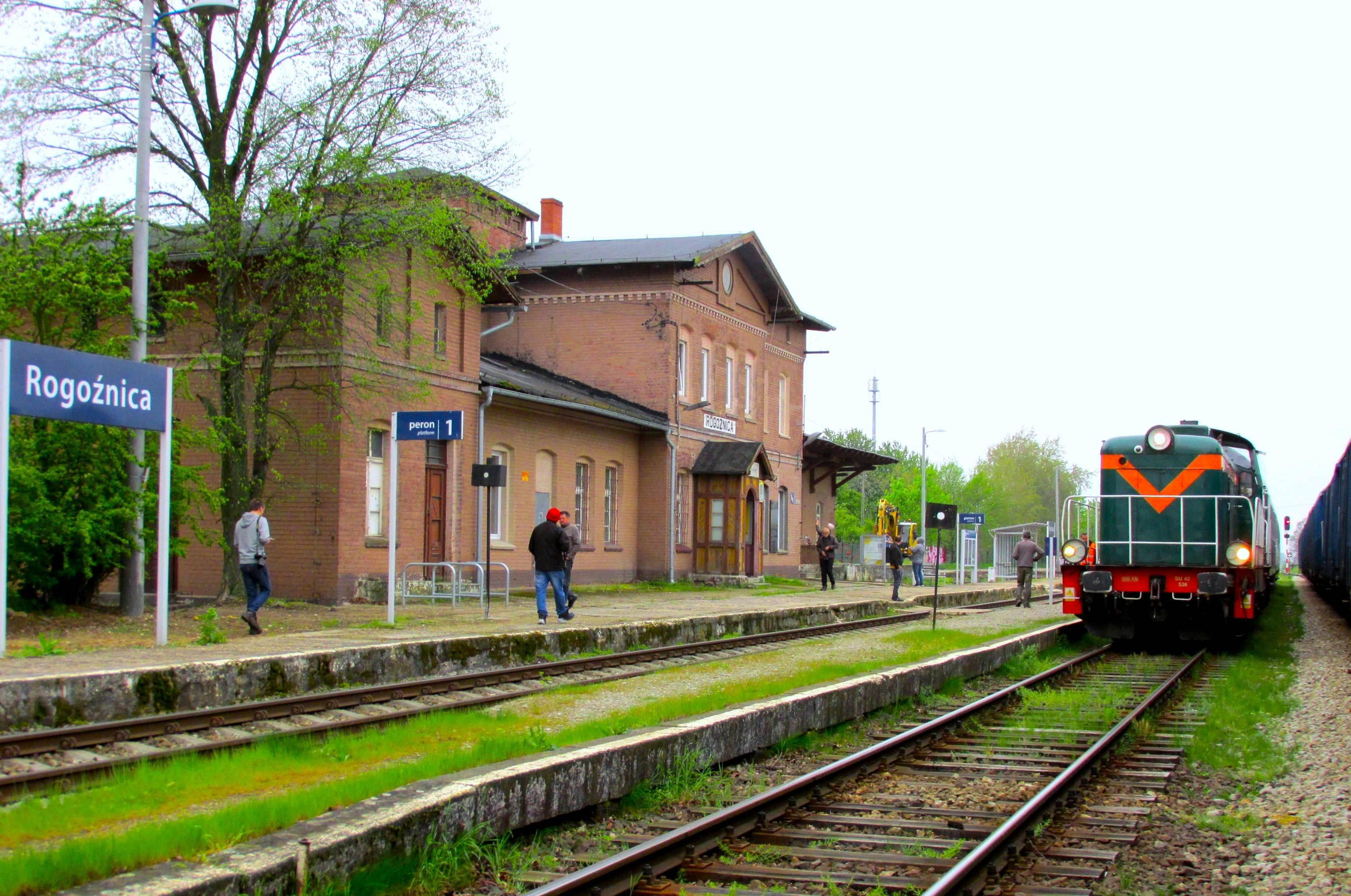 Rogoźnica; our BLS Wielkopolski Explorer awaits time. The granite plaque on the building is visible just beyond the wooden entrance.