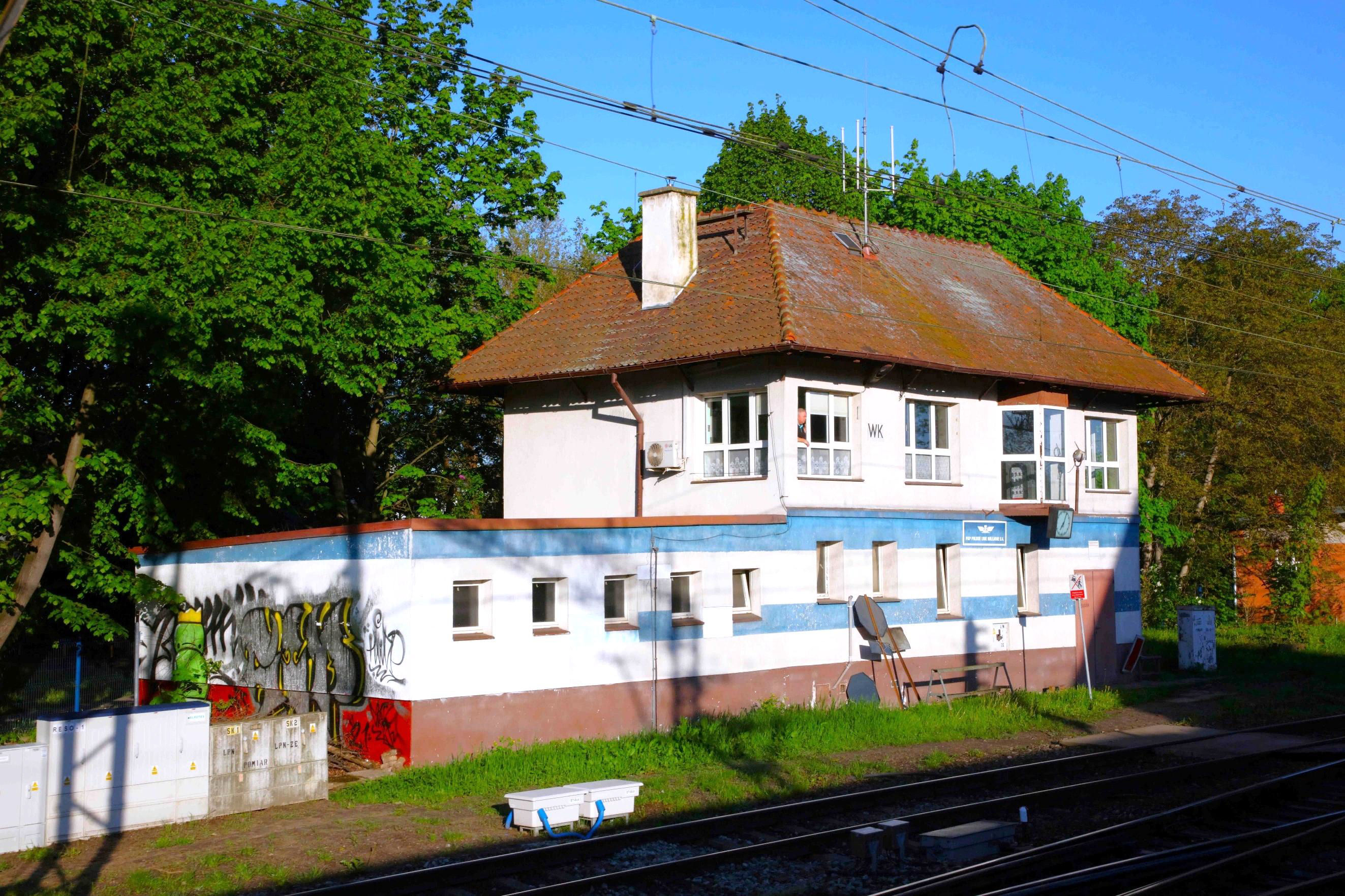 Wrocław Kuzniki signal cabin; the 'unhelpful' signalman is looking out of the window.