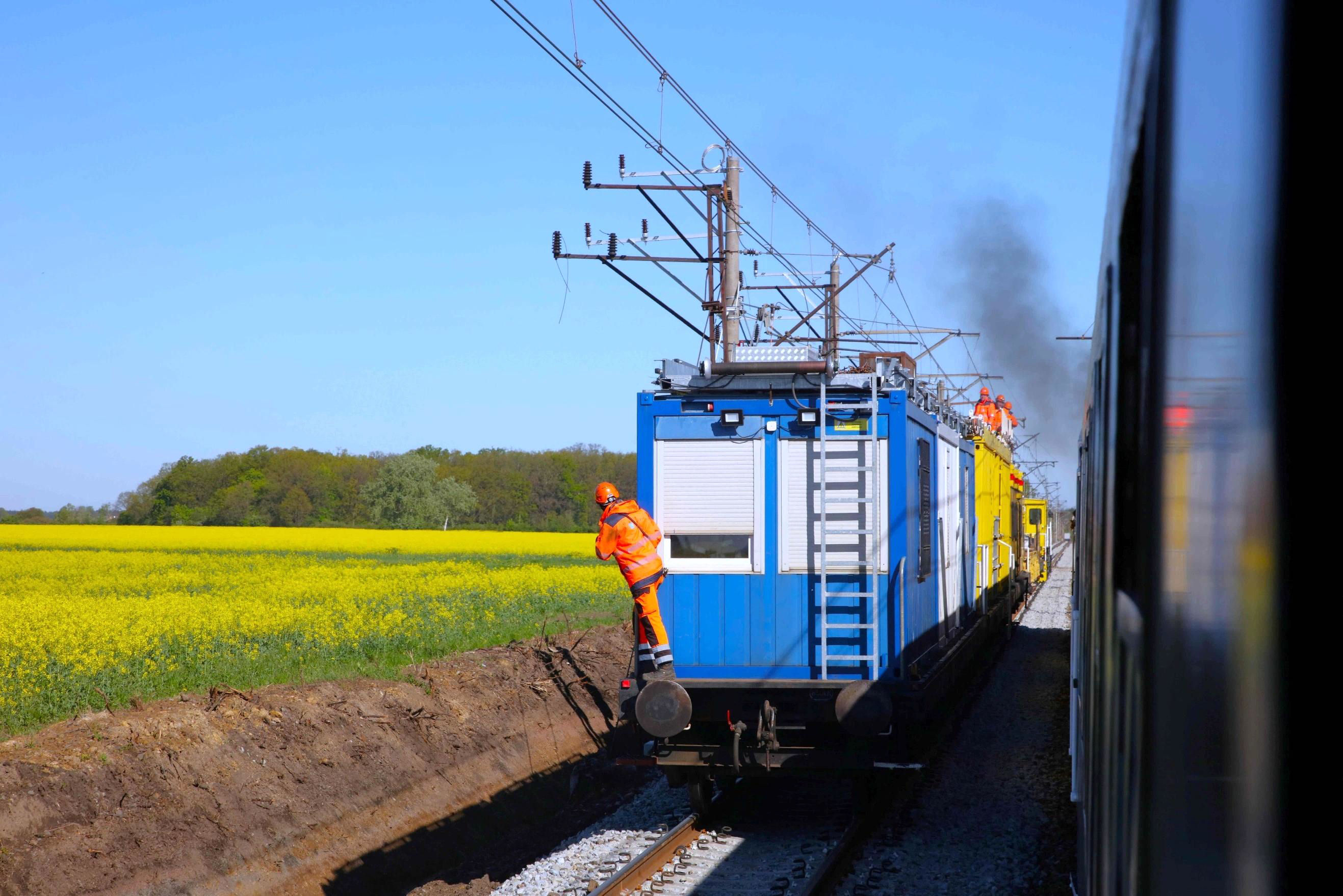 The tour passes an OHLE works train alongside an operational track. In the UK it would be rail replacement buses over the full length of the line.
