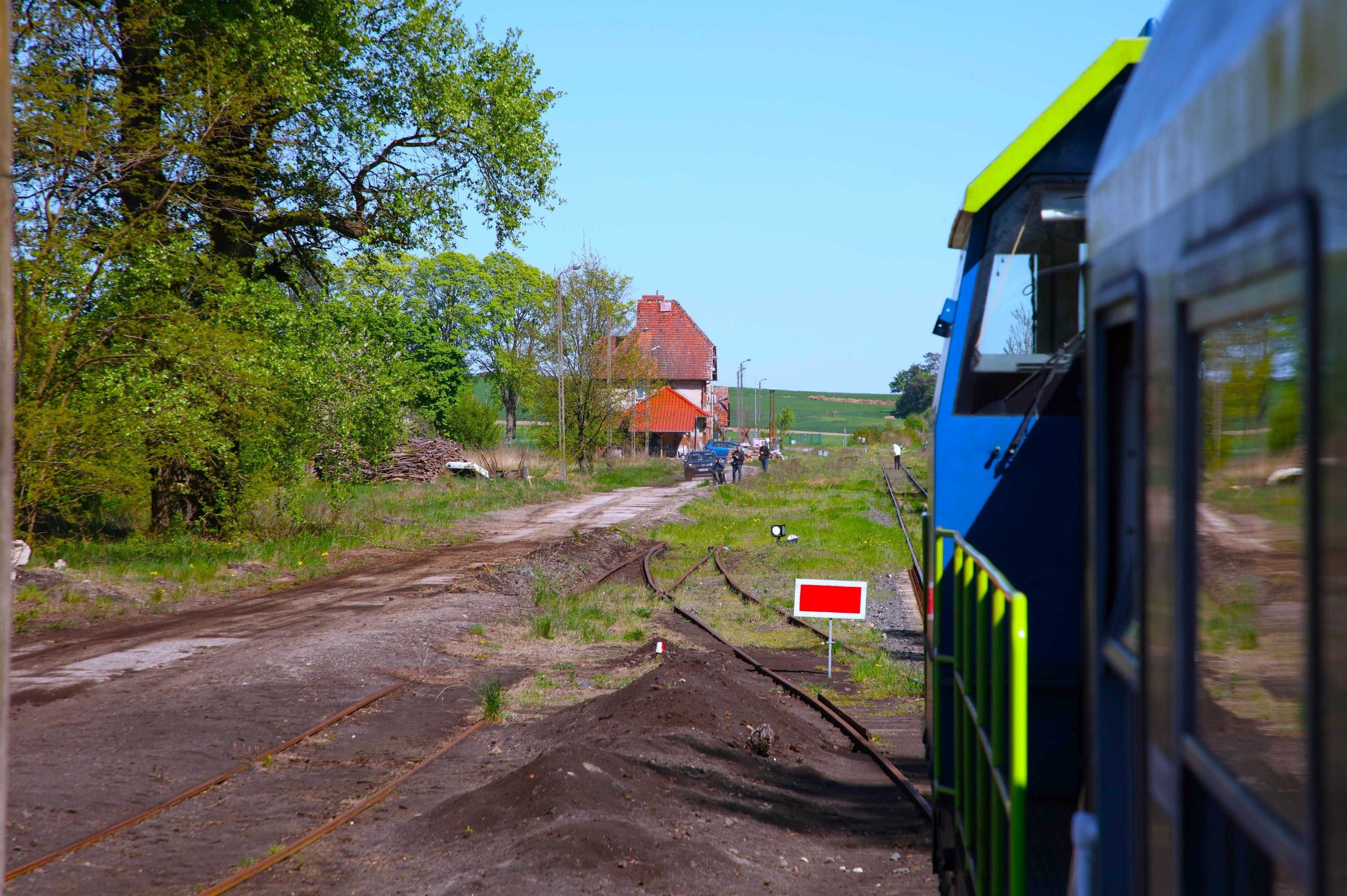 Approaching Sieniawa Lubuska where lignite used to be loaded (left) the former station is ahead and then the end of line.