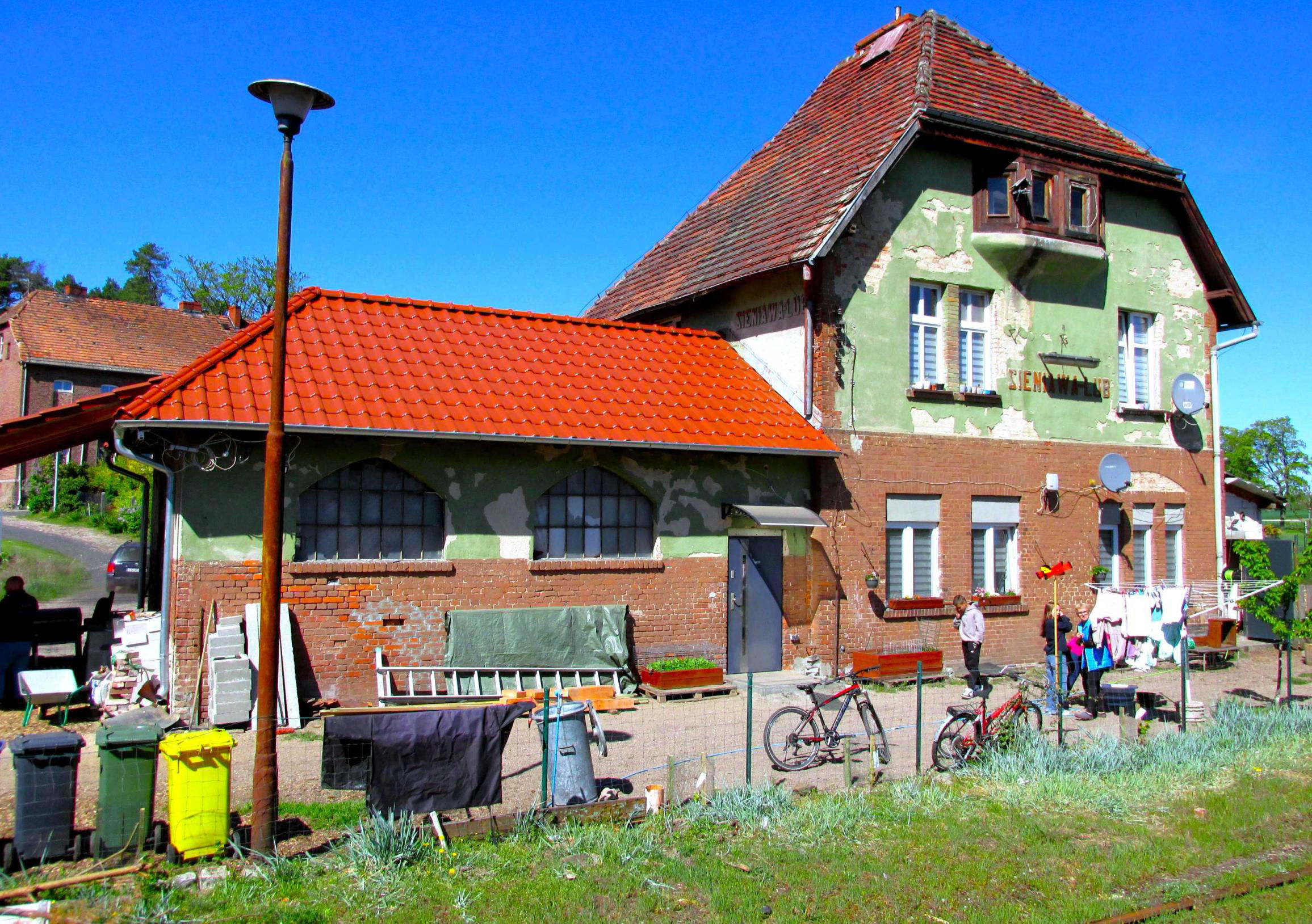 Sieniawa Lubuska from the tour, now a private dwelling, with a rotary washing line on the former platform.