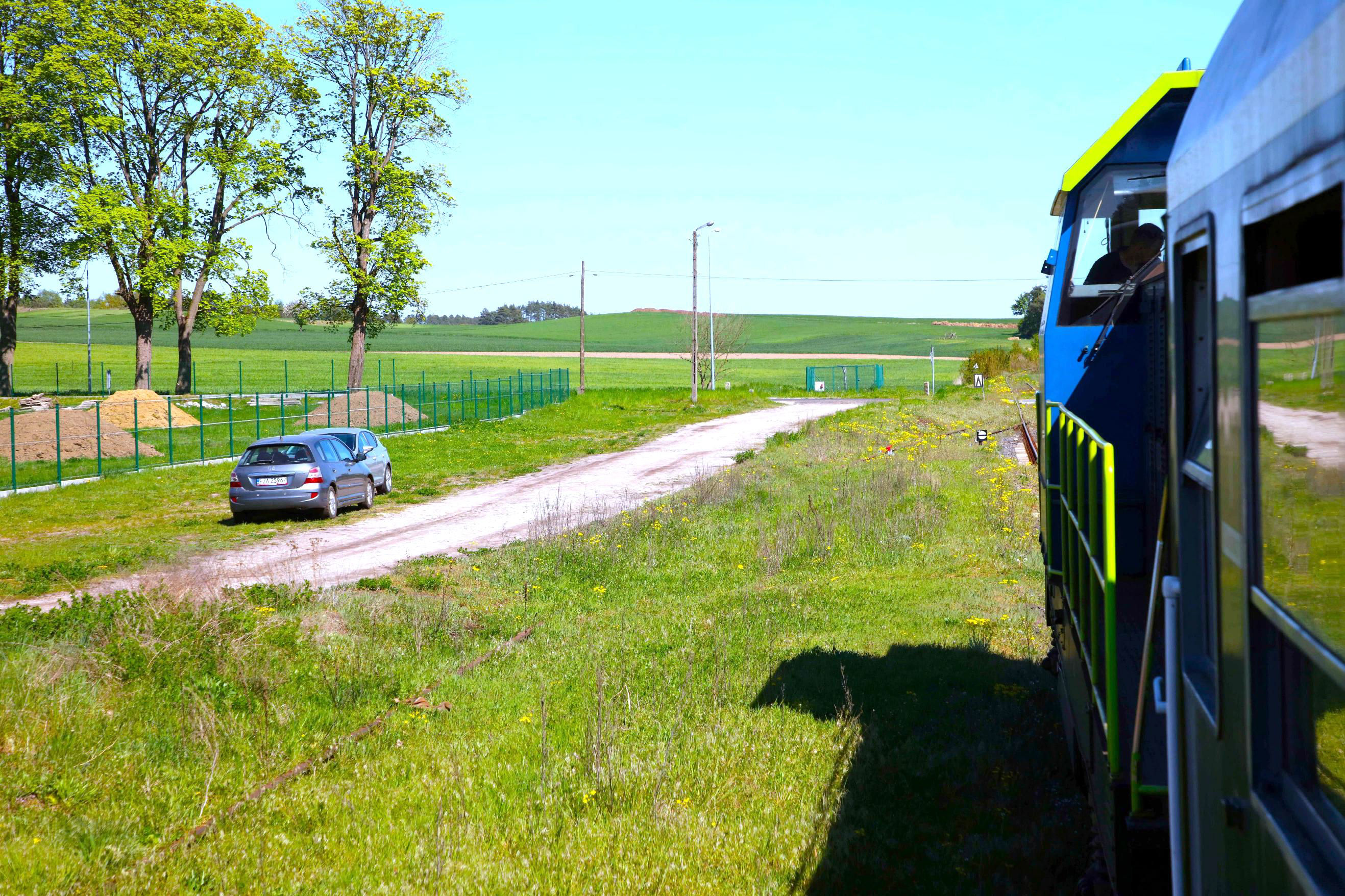 The tour crossed a wide and seemingly quite busy highway governed by traincrew activated barriers. No doubt this surprised occupants of the cars who filmed us passing on their phones, if only to assuage any disbelief when they told anyone at their destination, 11 minutes late due to a slow moving railtour at level crossing. At Toporów the effect of perverse incentives manifested itself in that, being charged by the hour, we dropped our rebuilt loco as soon as we could, This meant it had to return to Rzepin light engine, burning fuel in a separate path. You might think they would have said: Oh, just tow it back and we won't charge you for the last hour. Back at Rzepin, there was a brief pause from 15.57 to 16.01 about 43 down. Then we headed out on Line 822 for our next run round (if the crew don't receive a run round bonus, they're missing a trick.) at Kowalów. This is a pretty nondescript place but affords access to the Rzepin Avoiding Line - the next major track objective. The late afternoon was sunny and warm, making observation out of the open drop lights very comfortable. We headed south and veered right at Drzeńsko on what is the main line, the route towards Frankfurt (an der Oder) in Germany, only some 10km to the west as we made our long elliptic 10Km trip arriving at Jerzmanice Lubuskie to run round.