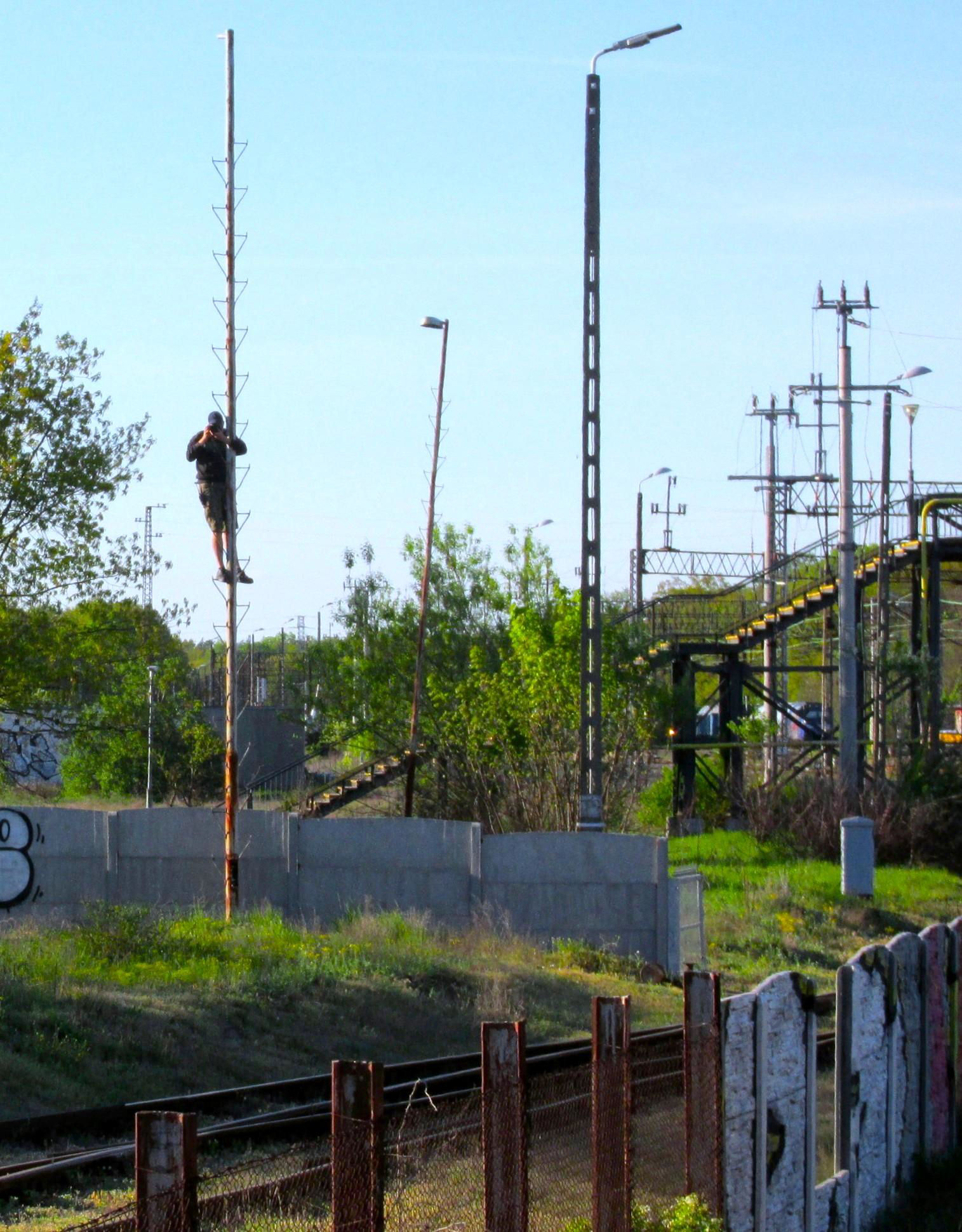 A local Pole halfway up a pole photographs our tour propelling around Curve 828 at Kostrzyn.