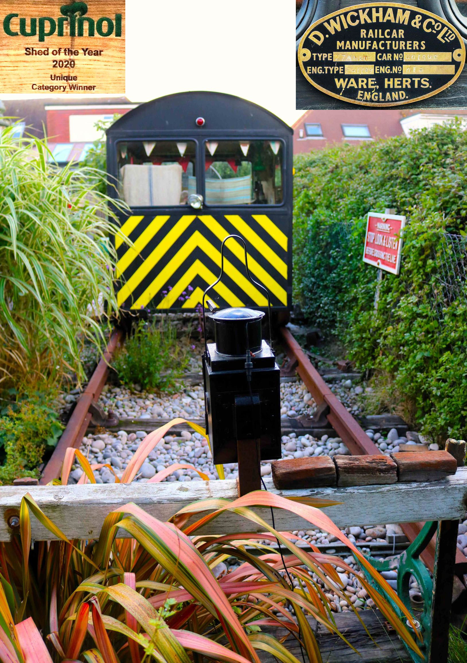 The Willingdon Wickham at the other end of the line. Inset Cuprinol shed of the year plaque and the Wickham-style works plate.