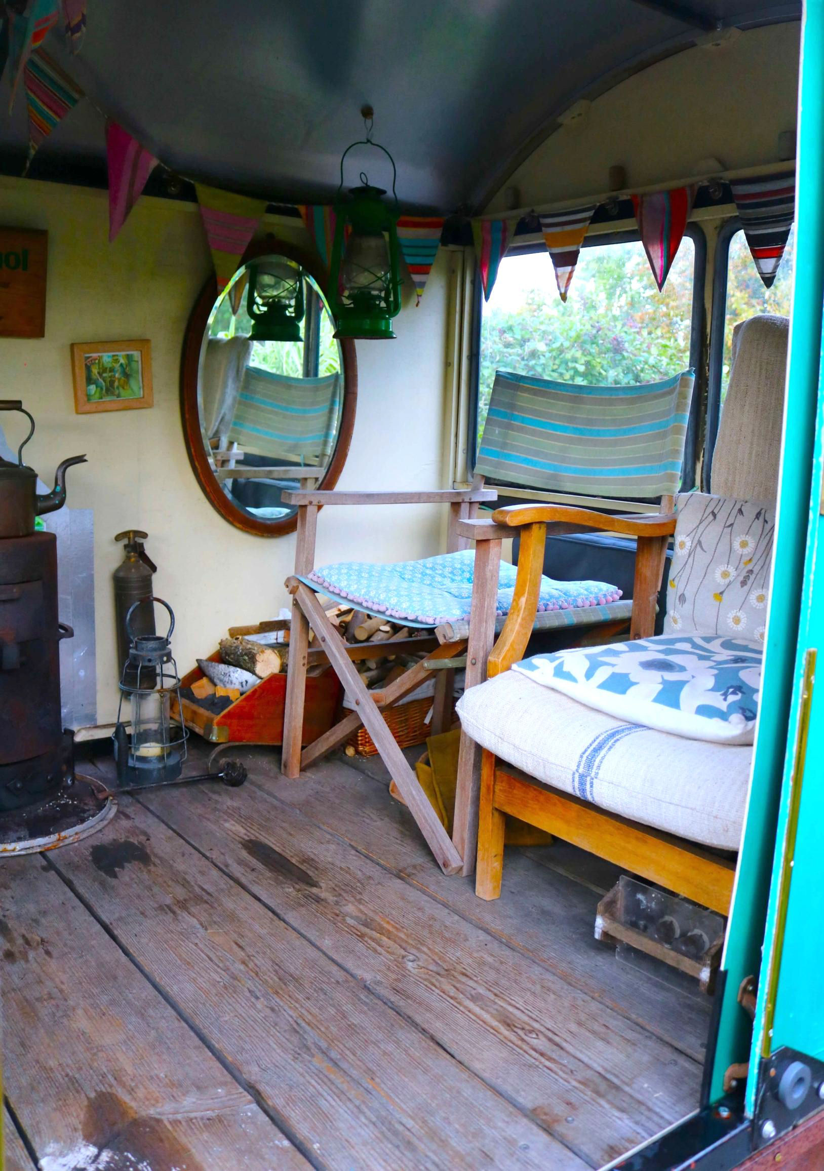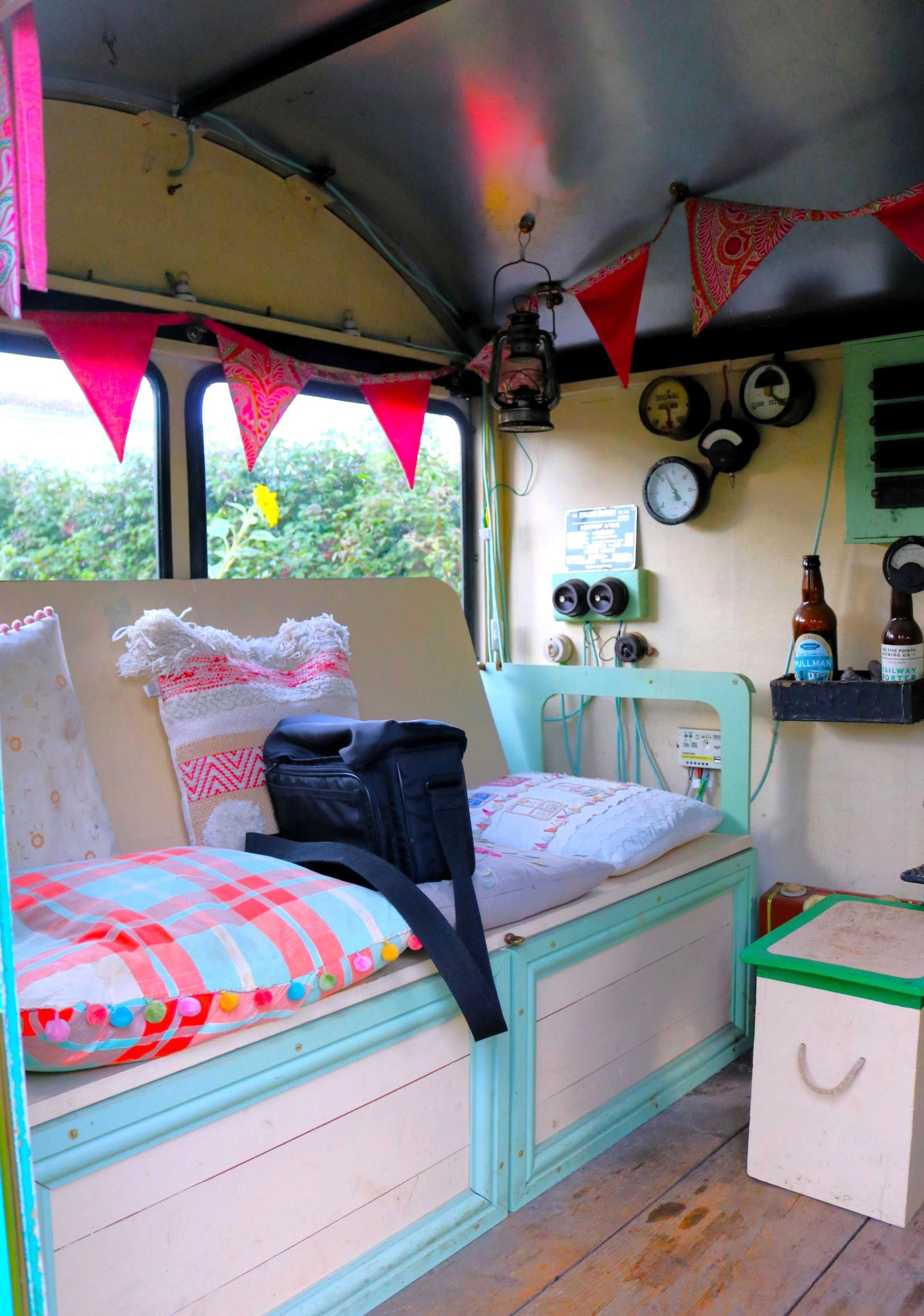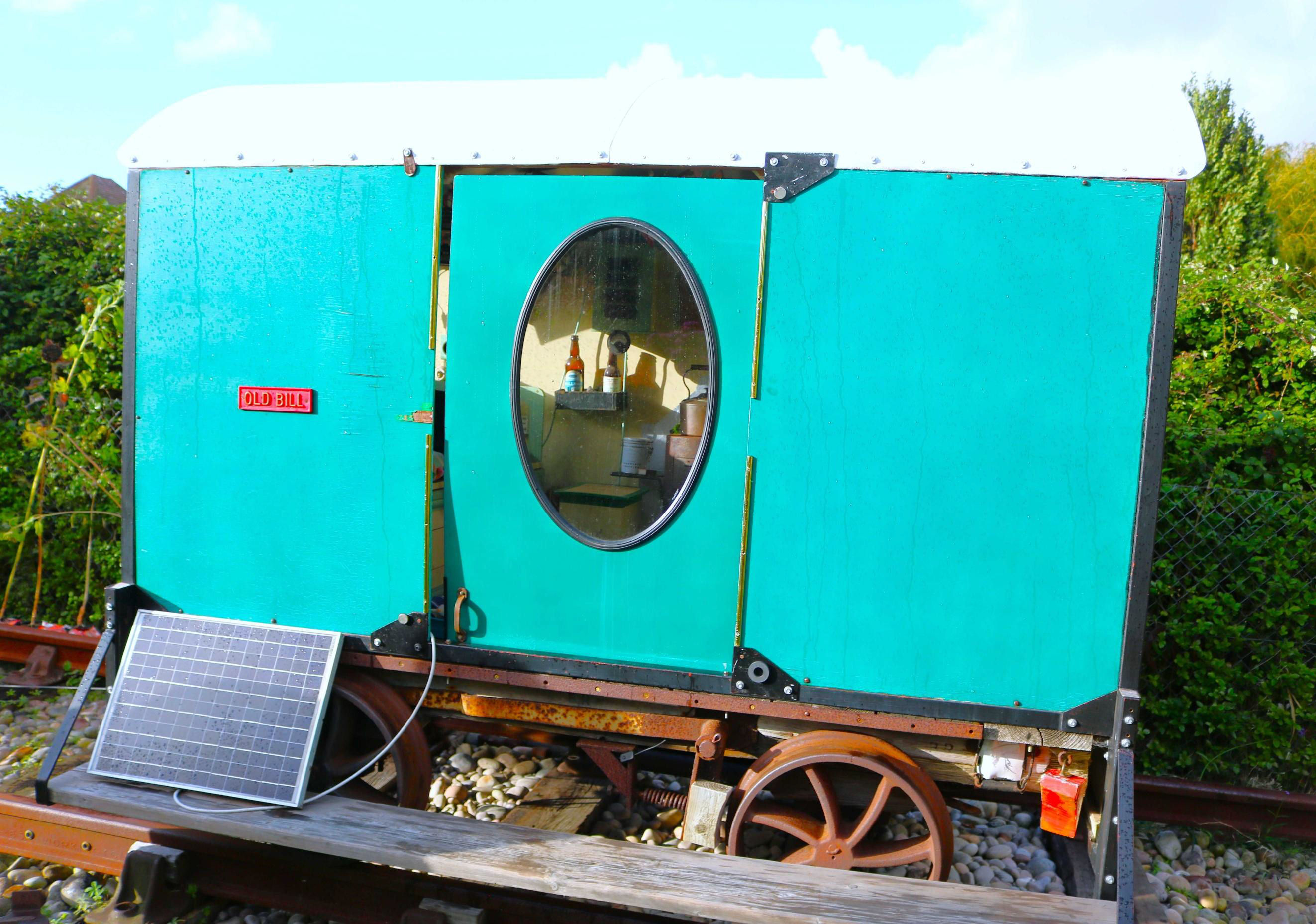 The standard gauge railway was initially suggested by Adrian's wife, Ruth, as a home for his platelayer's trolley when they moved to the house a few years ago. The flat trolley had been previously rescued from the Brighton Yard. The railway was started before Covid, originally about 30ft long and powered by winding a rope to haul the trolley along. During Lockdown, assisted by friends constructing various parts, a 'Wickham' style body was added to the trolley and has been fitted out to provide a comfortable room with plenty of amenities. A pair of chairs at one end and a bench the other end conceals the 12 volt car battery which now powers a winch as well as lighting inside and outside the vehicle. It also powers some electrical souvenirs from Adrian's previous employment with the electrical traction supply side of the mainline railway. A stove has been constructed to provide heat and cooking facilities. Adrian has slept out inside by placing planks between the seating areas to provide a level base on which to lie down.