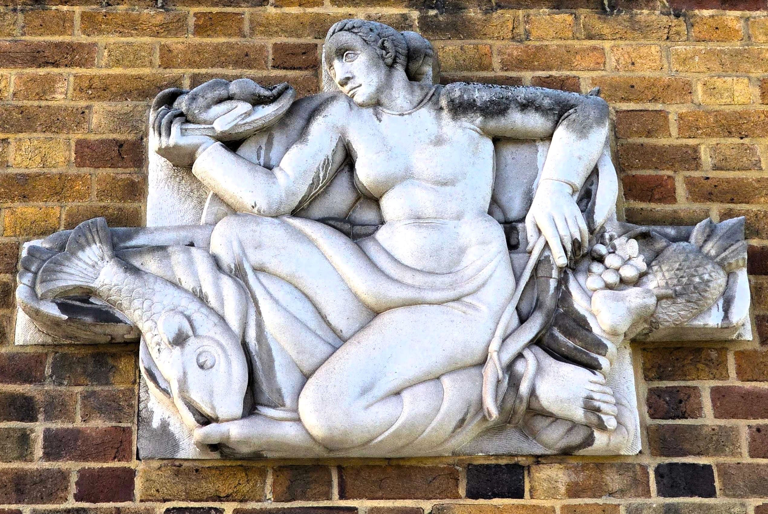The sculpture of Artemis (Diana) over the door of the adjacent London Transport Catering Training Centre, which could accommodate 1,200 staff.