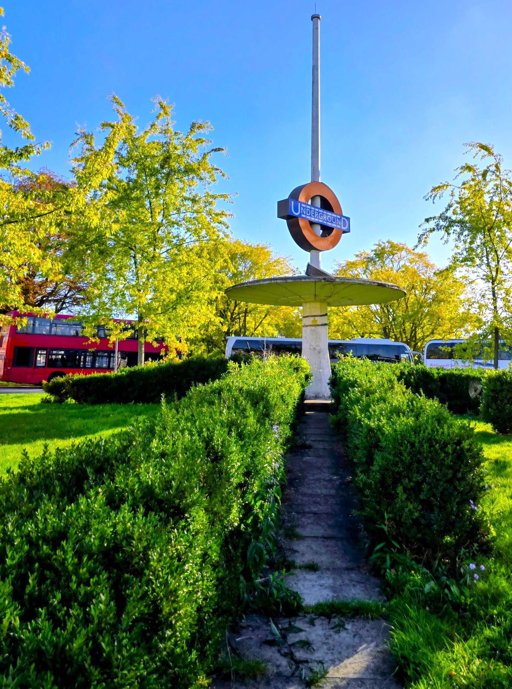 Queensbury The name has no historic connection to the area whatsoever and was apparently coined by a local property developer to match the adjacent suburb at Kingsbury. Of interest here is that the station itself, sitting as it does in the middle of an apartment block, does not have an external roundel. Instead it has two rare protruding blue name bars. However, across the road, in the middle of a roundabout, is a very prominent roundel indeed. Tempting as it was for the more athletic of our number, there was a notice attached, reading 'Do not climb, Danger of Death'. Warning heeded, no climbing ensued. At the time of construction (early 1930s), Laing's Estate was offering it as a site with 80 shops and 1,000 houses, freehold £595 - £1,000 with good terms. (£1,000 in 1930 = £83,530 now!)