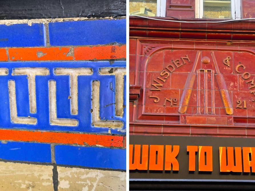 A segment of the 'LT' dado rail at Leicester Square station and detail of the cricket themed tiling which is lower right centre on the previous photo. Wisden's produced their cricket almanac in the offices above Leicester Square station.