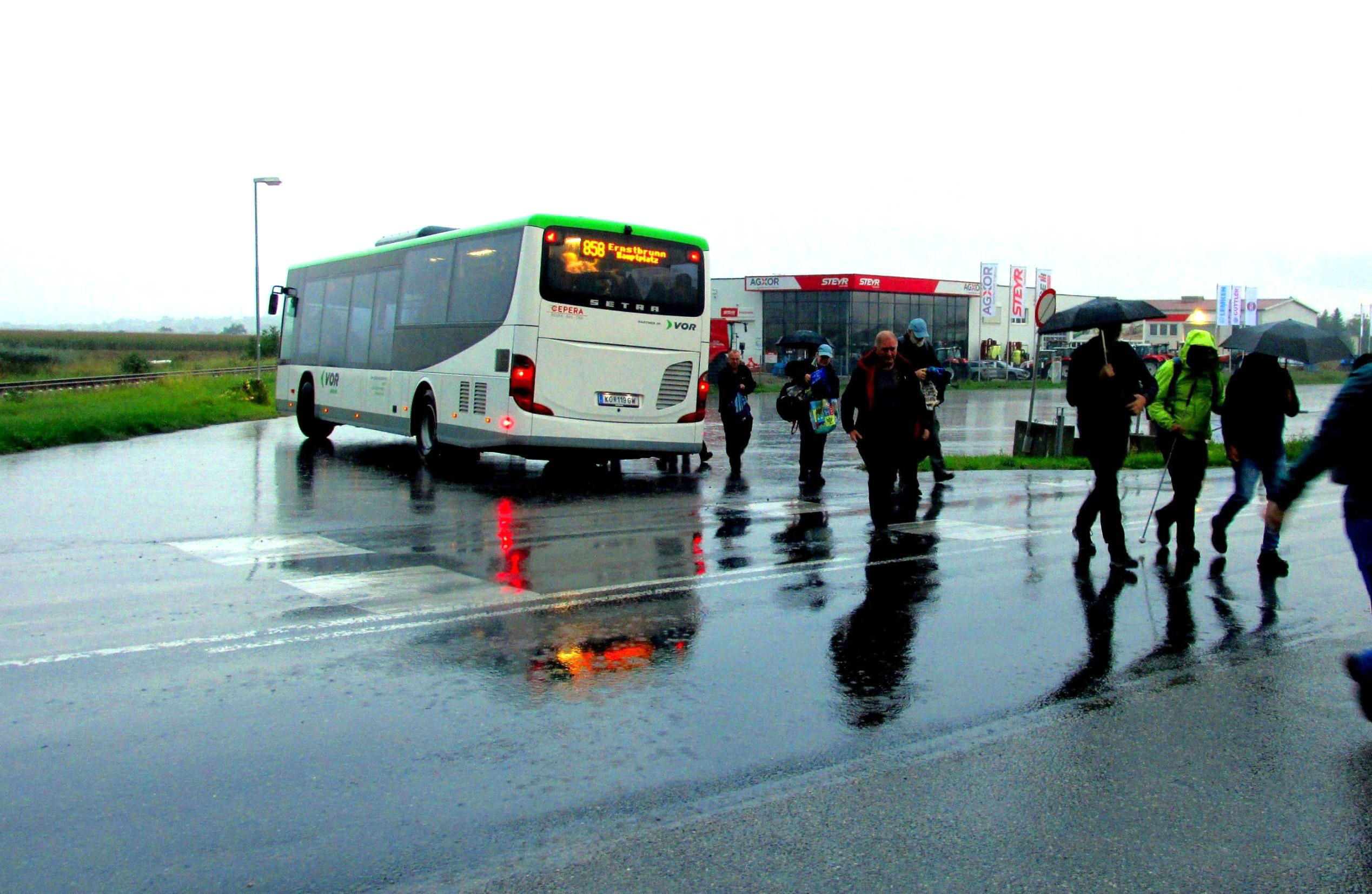 On arrival off the U-Bahn at Praterstern station in Vienna around 06.30, the intended service to Korneuburg (ultimately Znojmo) was on the Passenger Information System at 07.01 and, wandering around in the forlorn hope of a coffee, your reporter met a couple of other UK participants. We went up the escalators and, right on time, the double deck train swept into the platform (notably far less defensive driving here). On boarding, we joined the BLS section on the lower deck, made up of many familiar faces who had joined at Wien Hbf (Vienna Hauptbahnhof = main station) and other central Wien stations en route. As we made our way to Korneuburg, which only took 23 minutes (4 late), the sun came up, allegedly, as the black clouds and incessant rain largely negated the effect. Arrival saw us all move, as swiftly as the stairs and underpass would allow, to the front of the station where the 858 bus to Ernstbrunn Hauptplatz dutifully awaited our arrival, its driver primed for the unusual level of patronage!