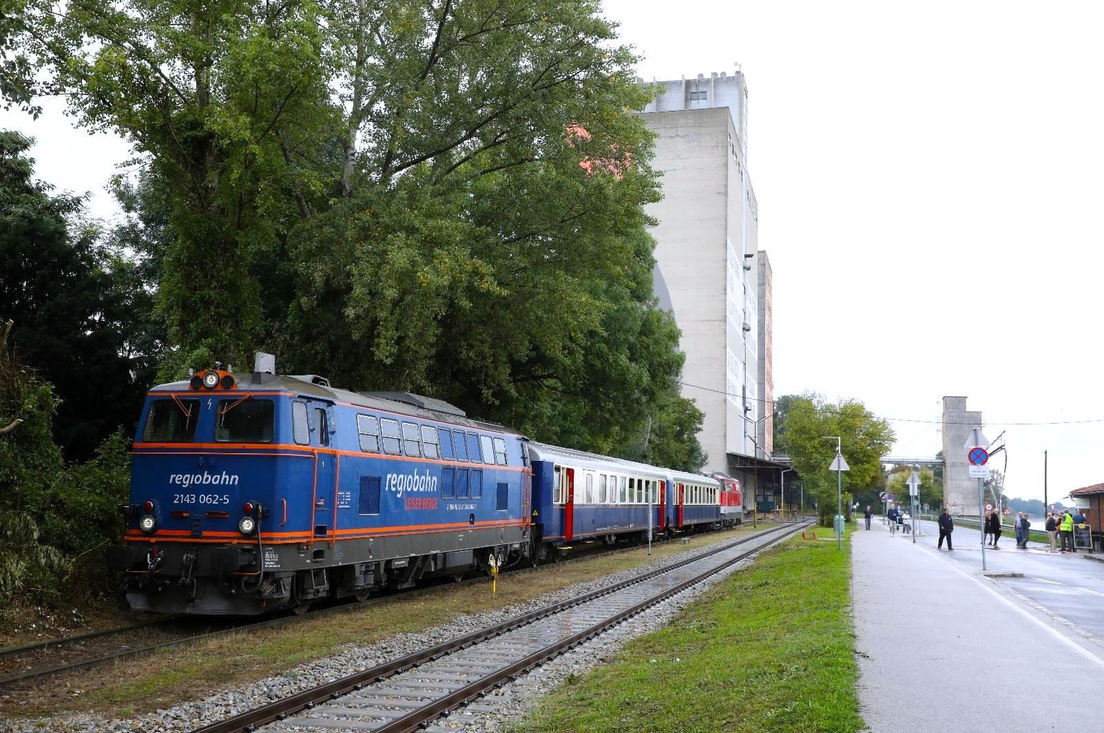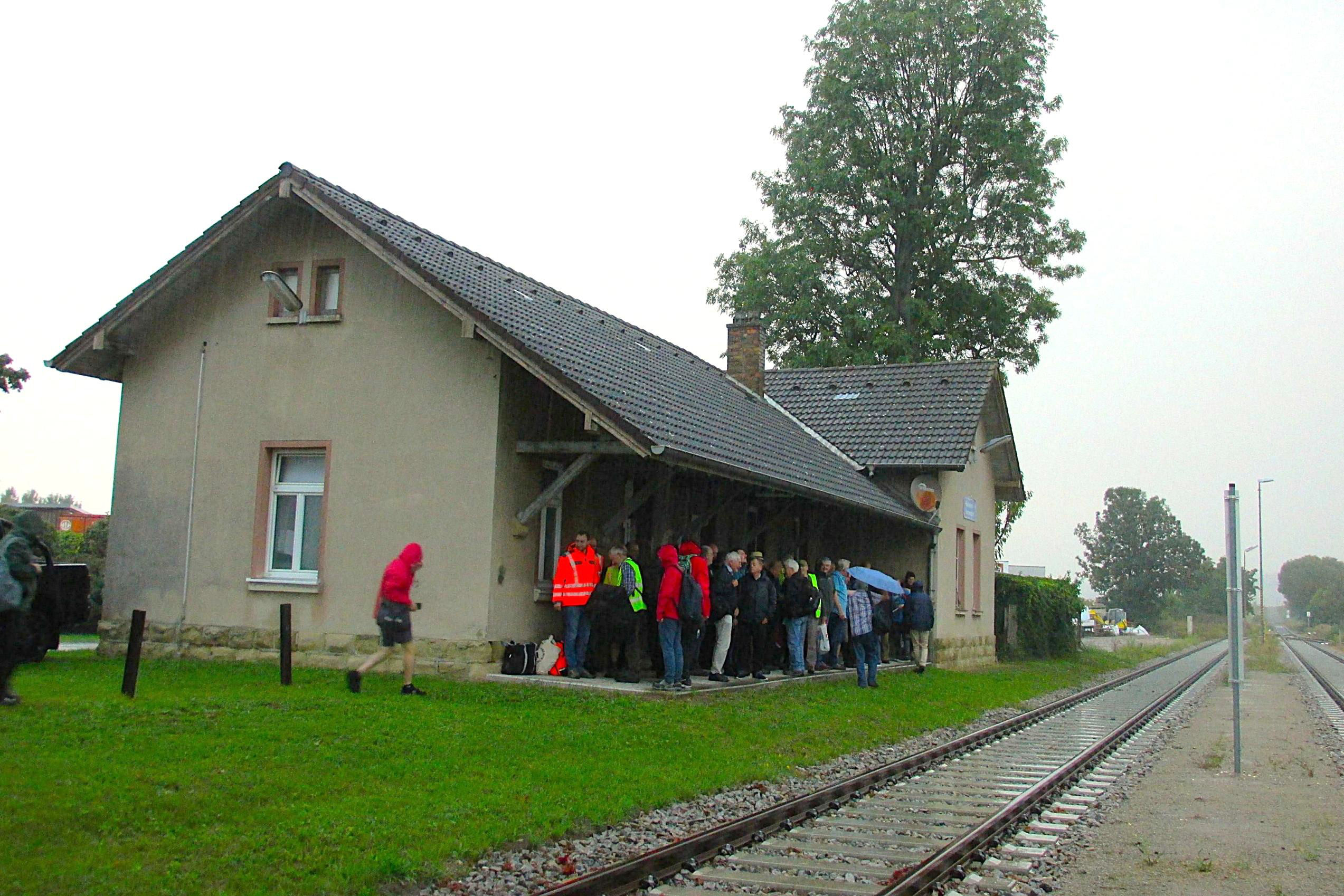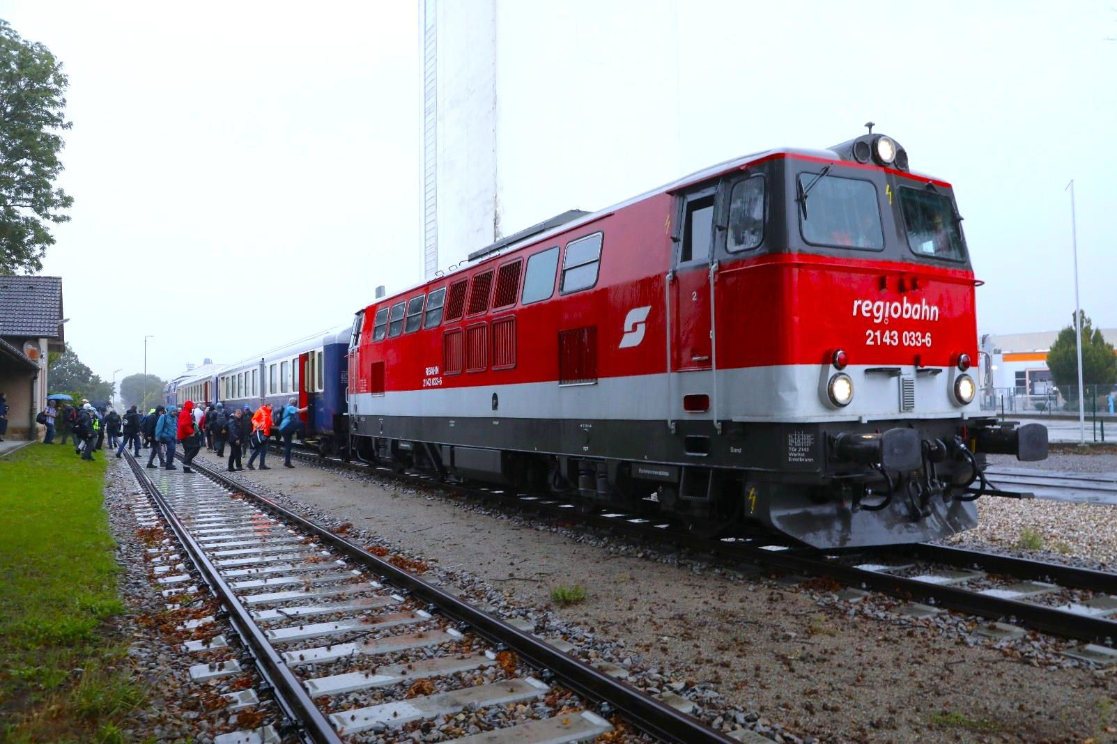 Once all were aboard, the bus left with every seat full and many standing, no doubt to the bemusement of the few locals unaware of our mission. I sat beside our UK tour organiser / co-ordinator Paul Griffin, who monitored progress on his phone as we had to bail out at a specific point on the main road and walk around 800m to the closed Rückersdorf-Harmannsdorf station, where we would board the ECS from Ernstbrunn. So, imagine our surprise and possibly for the normals' bewilderment, when we suddenly swung right off the main road (off the advertised bus route) and headed directly there. The bus turned around in the petrol station forecourt opposite the former station, where it then practically emptied. Peter had prevailed upon the driver to take us there to save a walk in the rain! It was still raining heavily, so the whole company took shelter under the small station awning, which probably never saw such numbers when the line was open for regular passenger traffic. Only a few minutes later, our short train formed of diesel hydraulic locos 2143-033 and 2143-062 'top & tail' on two open coaches, built in the early 1970s, trundled down the grade into the station and rapidly filled. We were away around 07.50. Some hardy souls had taken taxis to where the ECS had come from at Ernstbrunn and were already seated. As long as they had a valid ticket for the day, there was no objection to this (and see later…).