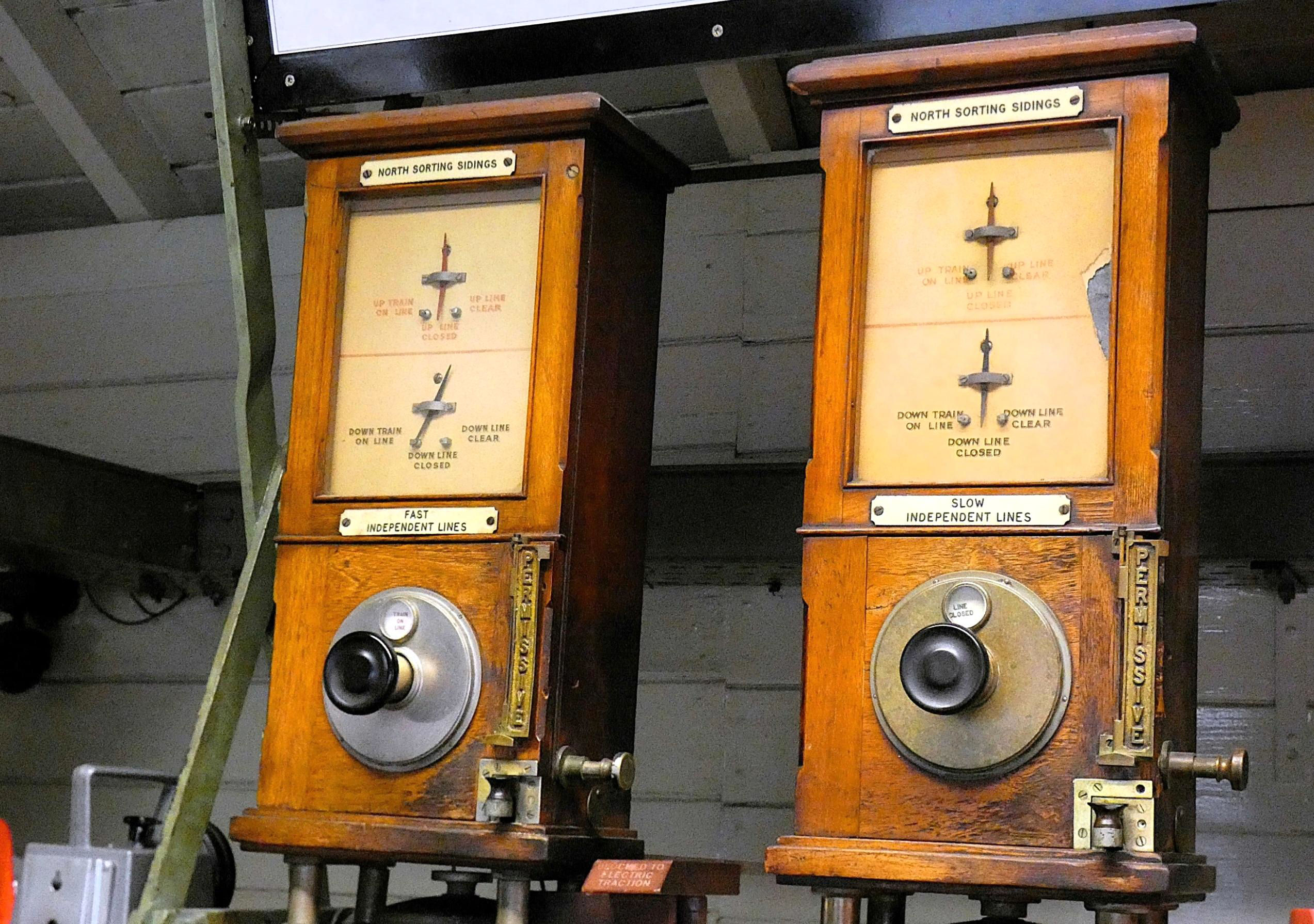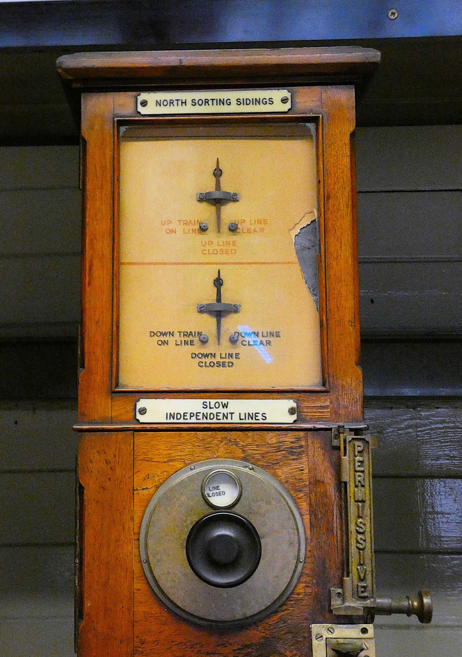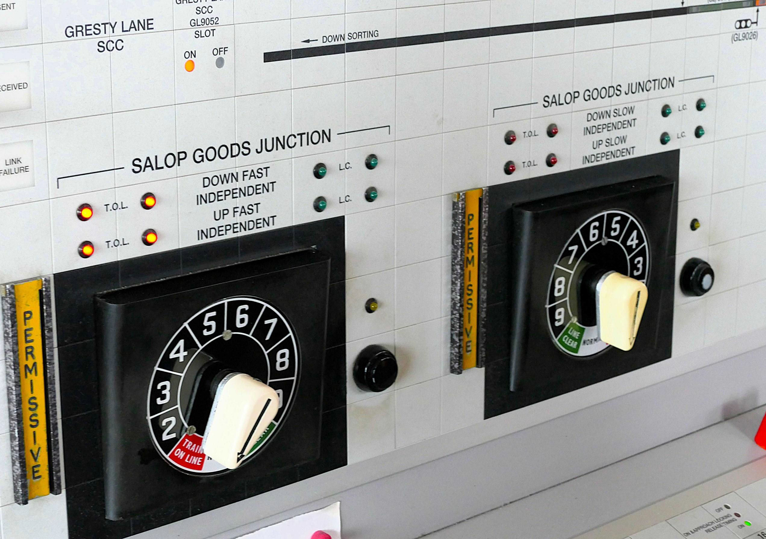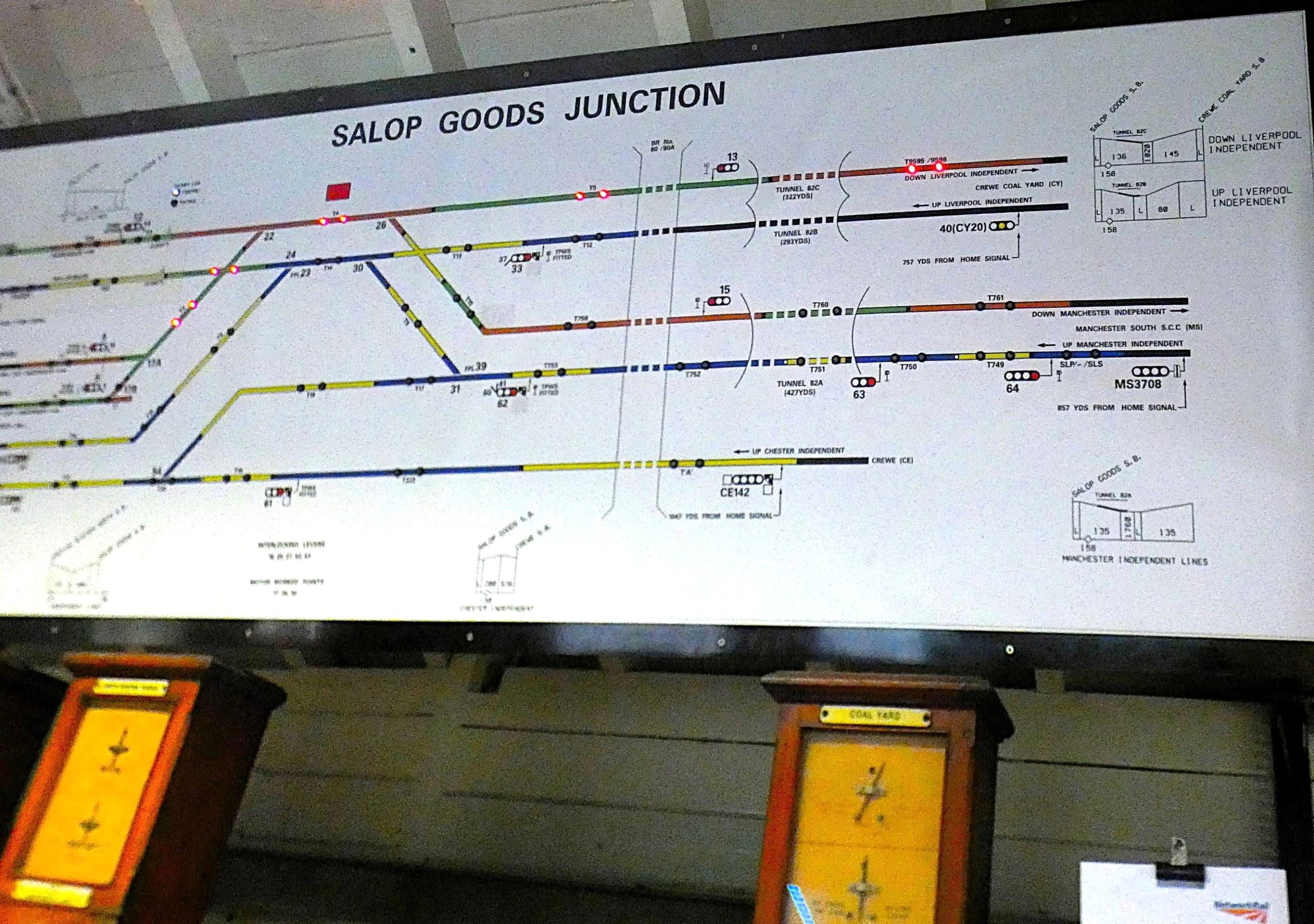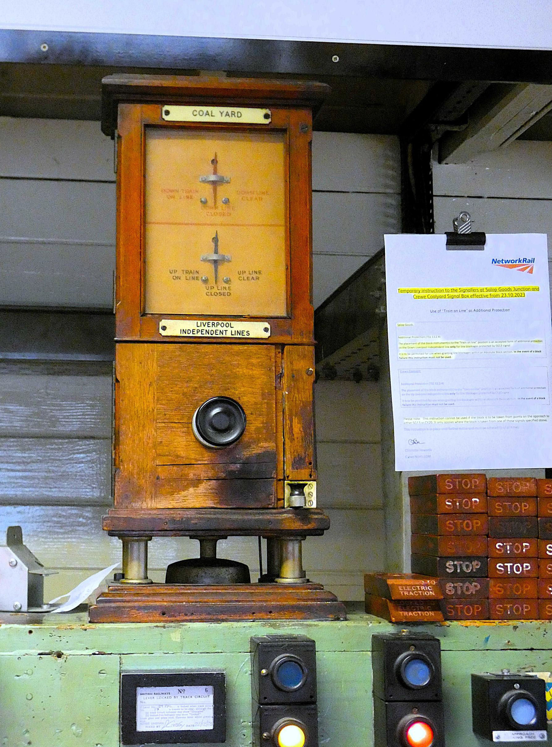 Salop Goods Junction box worked to five other signal boxes. The Liverpool Independents were worked Absolute Block (AB), using very elderly L&NWR block instruments, with Crewe Coal Yard box on the Up side of the WCML north of the station. The Manchester Independents interfaced with Manchester South Signalling SCC located in Stockport using Track Circuit Block (TCB). The Up Chester Independent was also worked by TCB, with Crewe SCC sending trains. Towards Shrewsbury, the box worked TCB to Gresty Lane SCC, a 2015 NX panel which replaced the ex-L&NWR Gresty Lane box and operates as a separate signal box within the Crewe SCC building. All of these routes were covered by a single train describer which identified and indicated the position of trains on these lines.