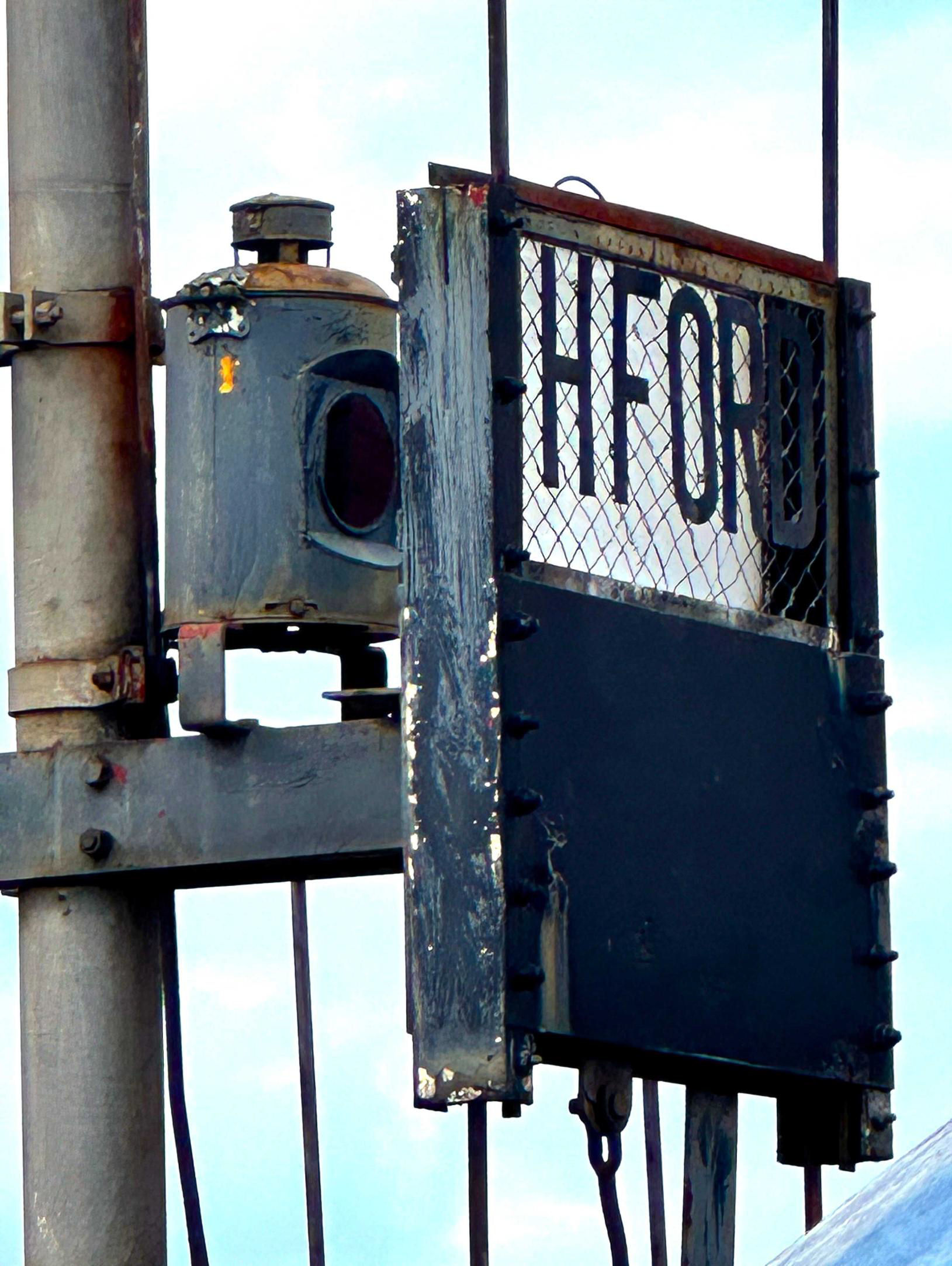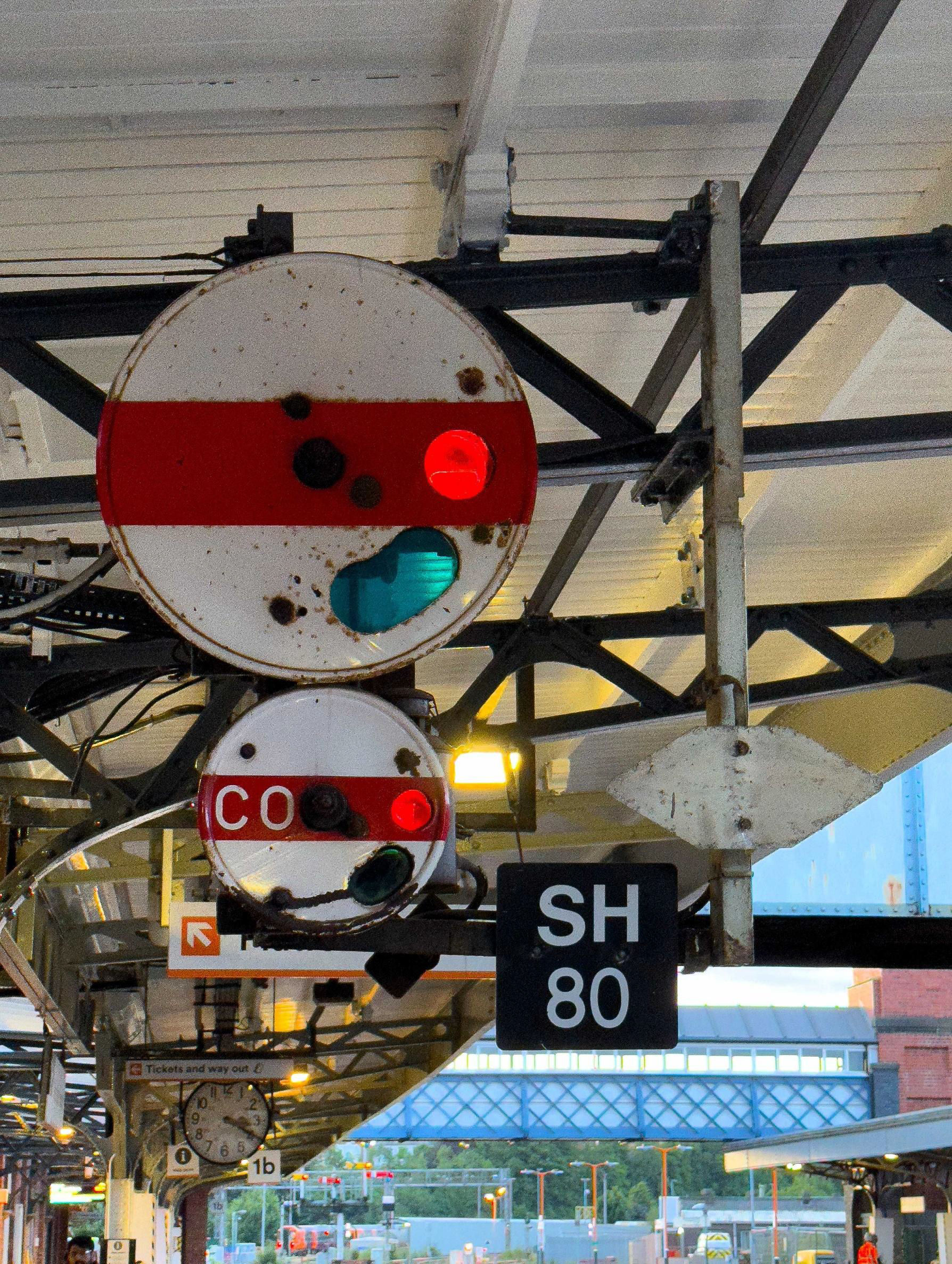 'SH80' The remaining 'banjo' signal, half way along Down P1 facing London with its subsidiary calling on disc. There were once six of these at the station.