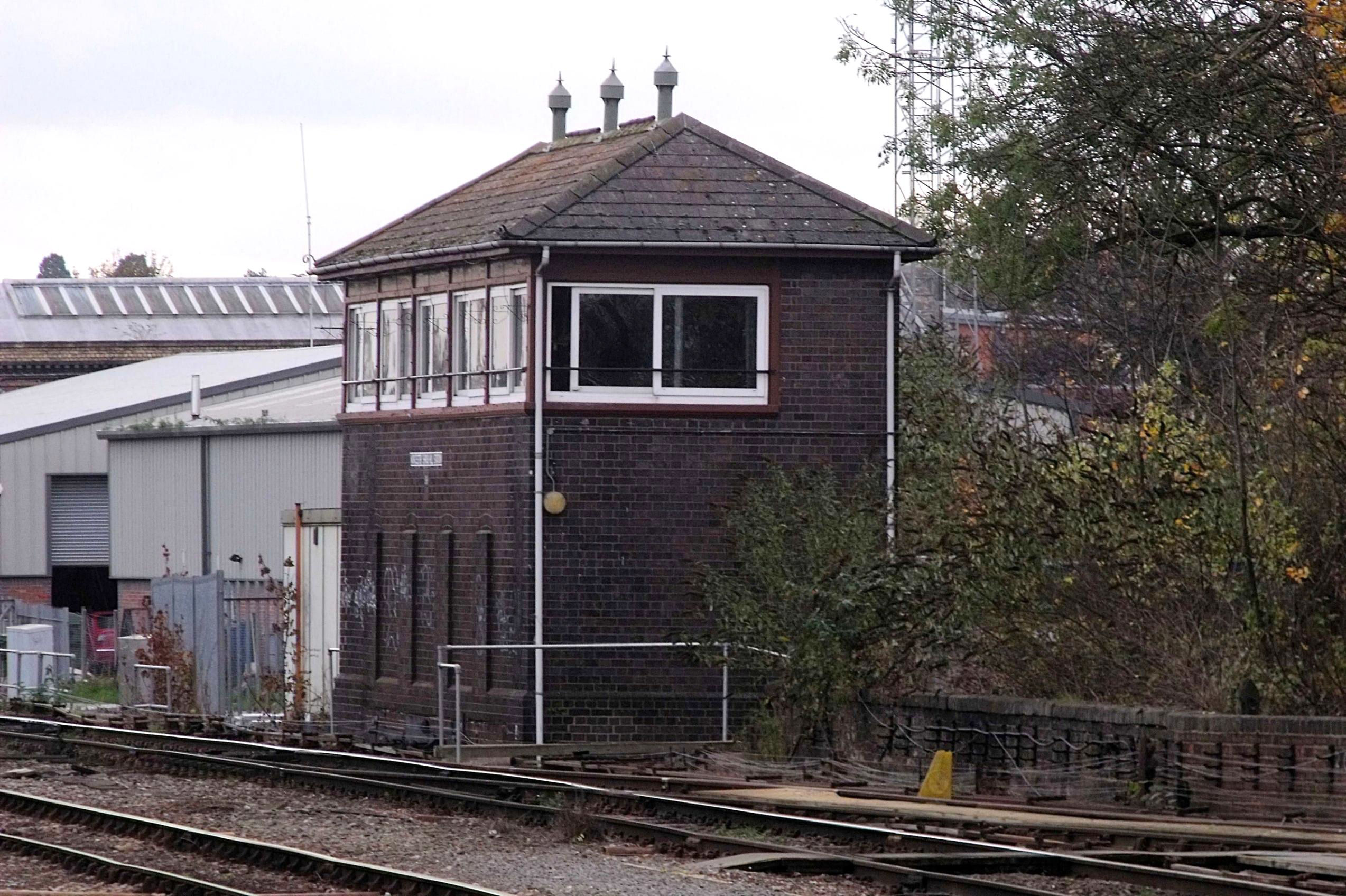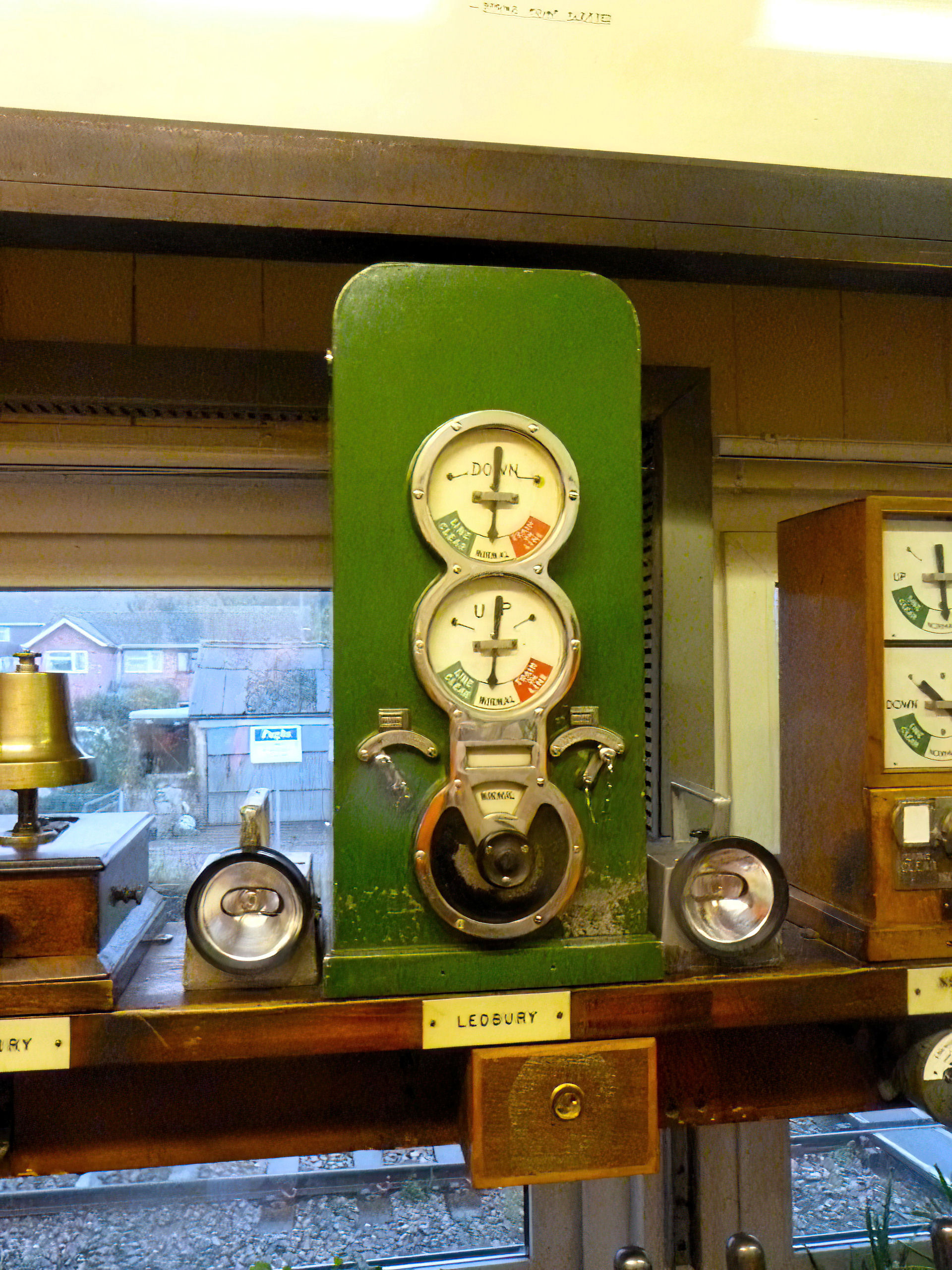 This is on the west (Down) side of the lines, south of the station and has an internal staircase to reach the operating floor. The GWR Type 11 signal box, dating from 1935, is built from dark blue engineering brick, with cast iron soil pipe painted in brown and three possibly original ventilators along the ridge line, at least one of which still has the correct fitting on the inside. Internally, an 84-lever, British Rail (BR) 5-bar vertical tappet frame (4 inch lever spacing) is to be found with GWR 1947 Tyers block instruments in wooden cases above. It works a combination of absolute block, acceptance lever and track circuit block to the adjacent boxes (Henwick, Worcester Tunnel Junction and Norton Junction). 57 operational levers are still present plus 8 white (out of use) levers, a total of 65. Lever number 80 ('Down Main Starting') was noted, which controls the famous disc. Two diagrams are mounted above the frame.