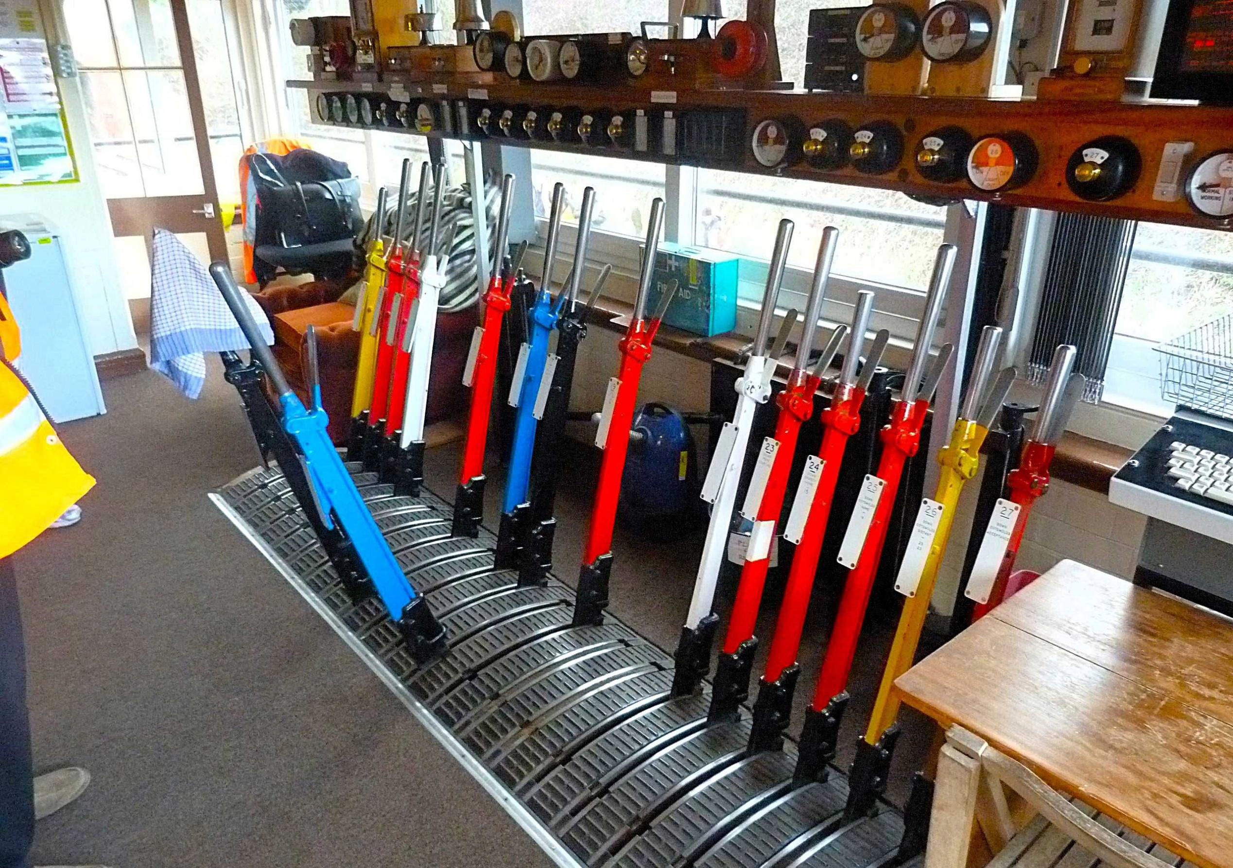 The 27-lever frame has 16 operational levers, plus 2 white (spare) levers. Interestingly, lever sections 1-7 and 27-33 have been completely removed from the GWR 3-bar horizontal tappet frame (5¼" lever spacing), suggesting that these changes were carried out many years ago by GWR locking fitters. The box fringes with Evesham box on the North Cotswolds line, Birmingham Rail Operating Centre (BROC) - Bromsgrove Workstation on the Gloucester line and Worcester Shrub Hill. There is a combined Westinghouse train describer system used for communication with Evesham and BROC, under track circuit block, with absolute block being worked to Shrub Hill via a British Railways 1947 Tyers instrument.