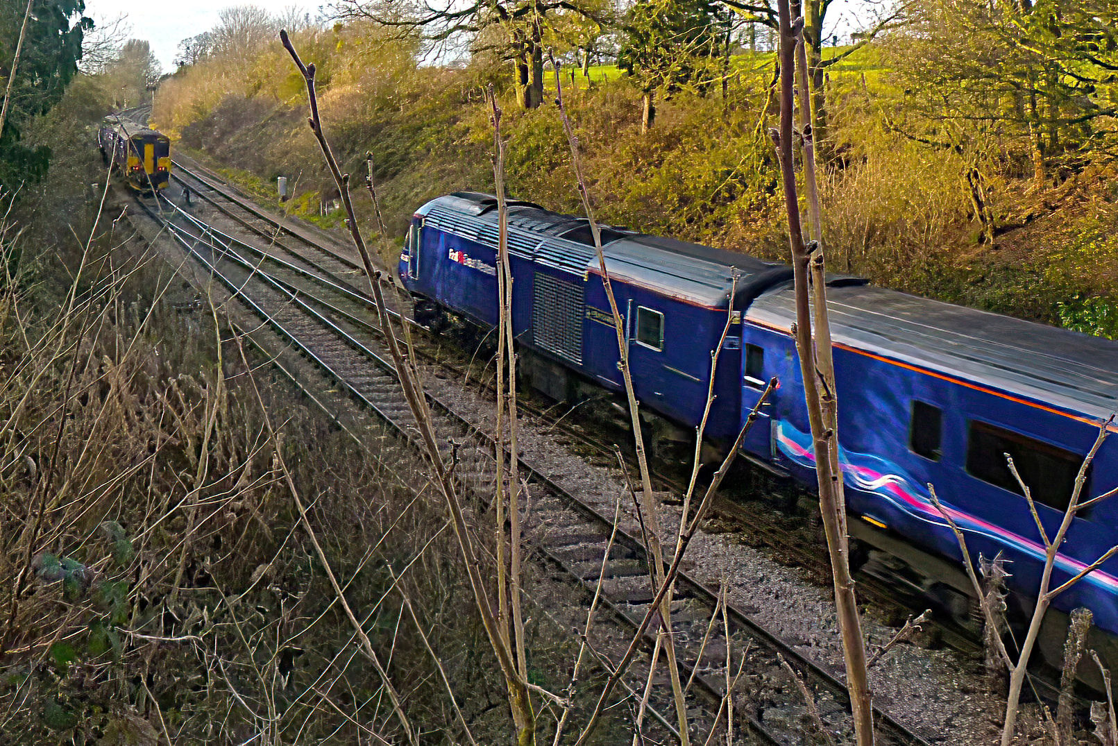 From the signal box, the DMU (from Bristol to Great Malvern) meets an HST to London via the North Cotswold Line and Oxford.