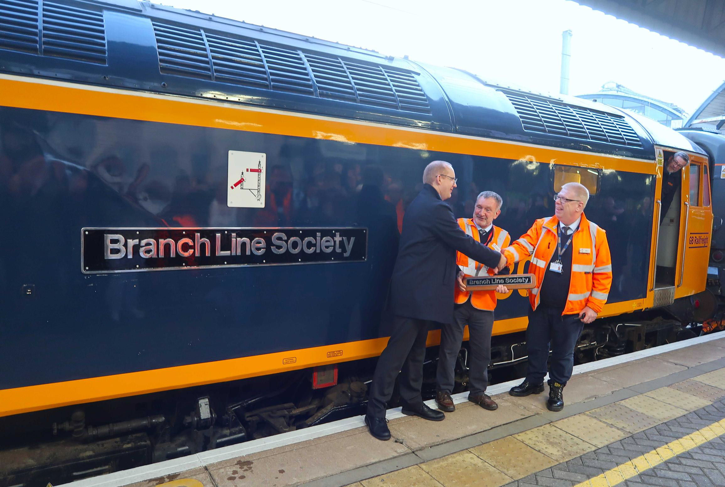 57306 after being named 'Branch Line Society' at Newcastle, left to right: Ian Grey (GBRf), Graeme Jolley (our Chairman) and Kev Adlam (Fixtures Secretary).