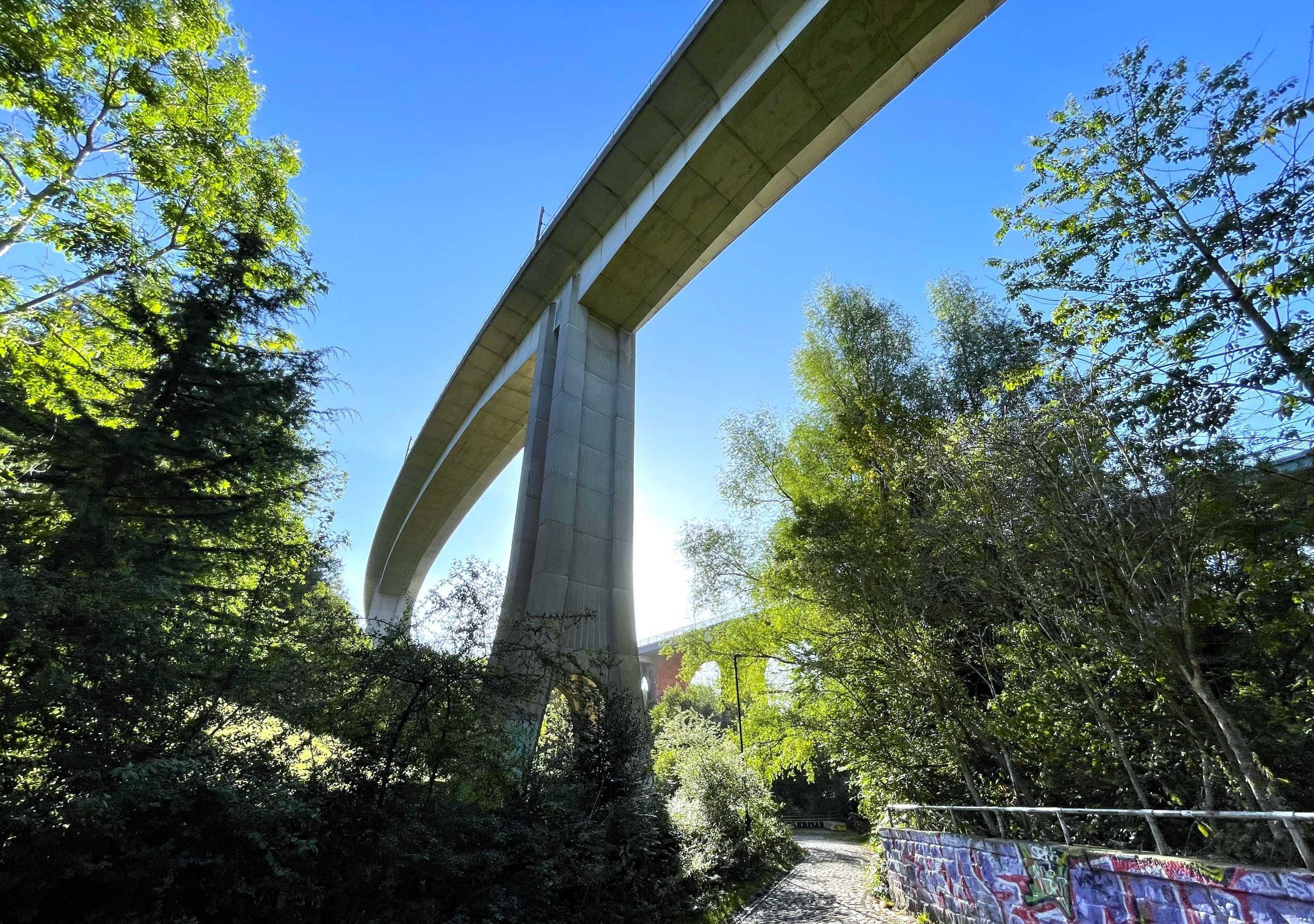 From here, we walked past Ouseburn urban farm into a wooded area to see Ouseburn Viaduct up close, together with the slender concrete form of the T&W Metro's later Byker Viaduct, which threads its way between the railway viaduct and Byker Road Bridge. The 2,674ft long Byker Viaduct was constructed between 1976 and 1979, the first such structure in Britain to be built using cantilevered concrete sections, with joints glued with epoxy resin. We climbed a considerable slope to regain street level at Stepney Road. From here, we walked through residential streets to Manors Metro stop where, following a slight detour due to construction works, we used a footbridge to reach Trafalgar St.