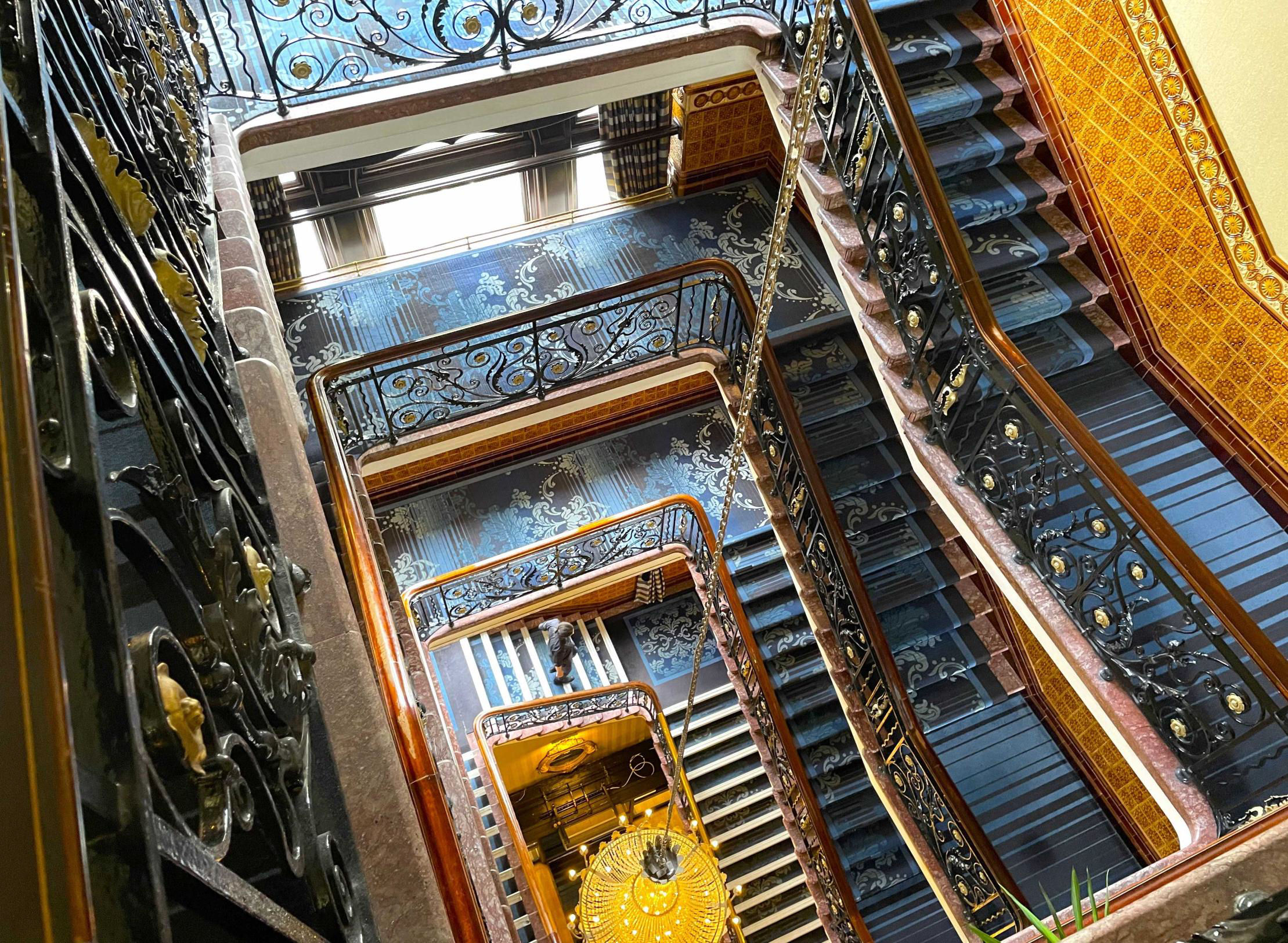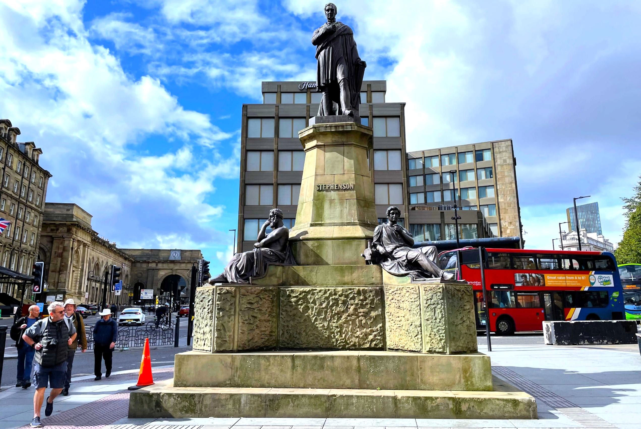 Our group took the steps up to street level for a quick break before going on to explore around the outside of Central station. We saw the original location of the station clock, on a now blank tower above the hotel, the stone carving of the River God 'Tyne' on the station building, No1 Neville St that was the North Eastern Railway Accountants' Offices and, behind, the former carriage shed. At the junction of Westgate Rd and Neville St stands the Stephenson Monument (1862). Opposite is the Royal Station Hotel that has been expanded over the years. We went inside to see the grand staircase, via a lift to the top floor, noting the later chandeliers and Burmantofts tiling, that also features in the grand function room corridor, plus the sweep of the original building's first central staircase.
