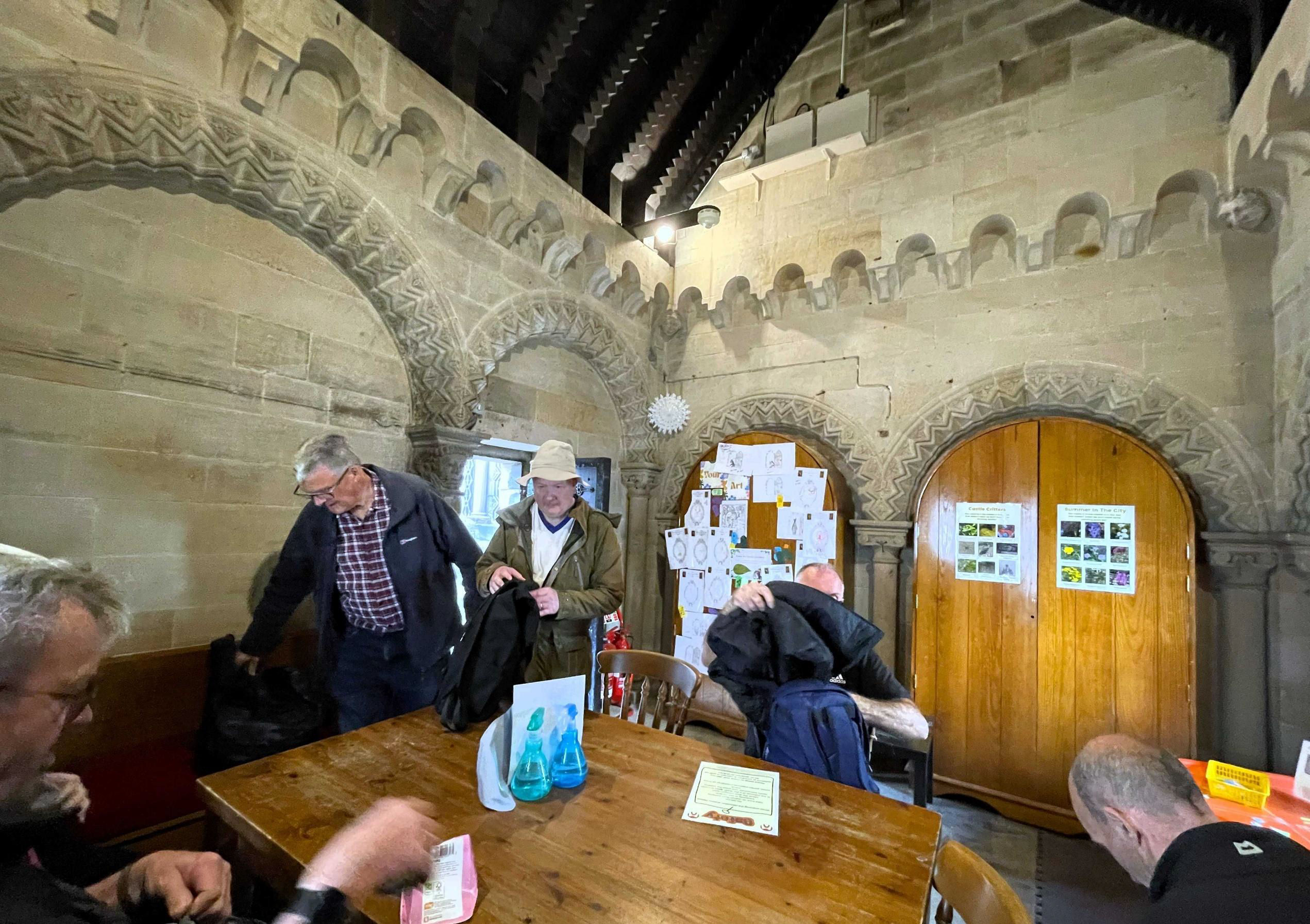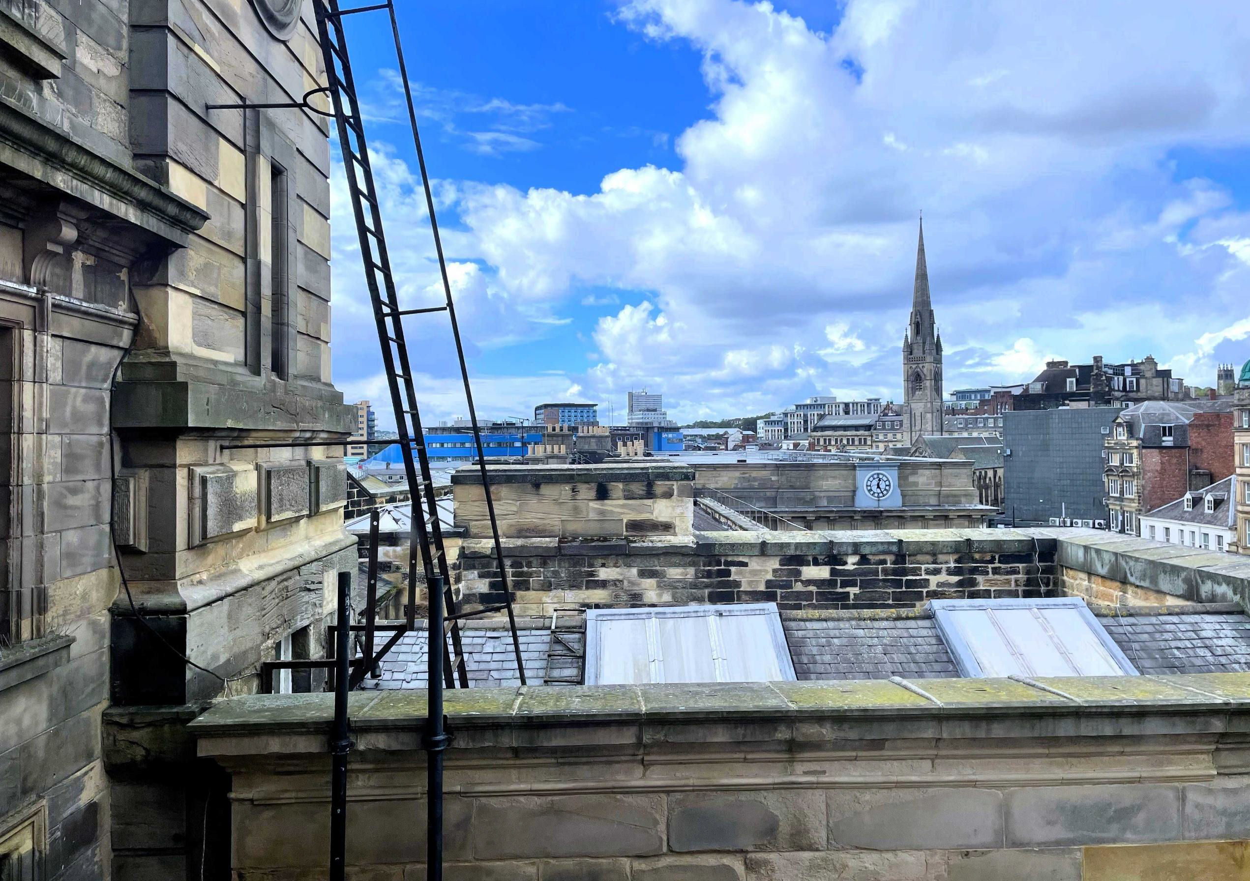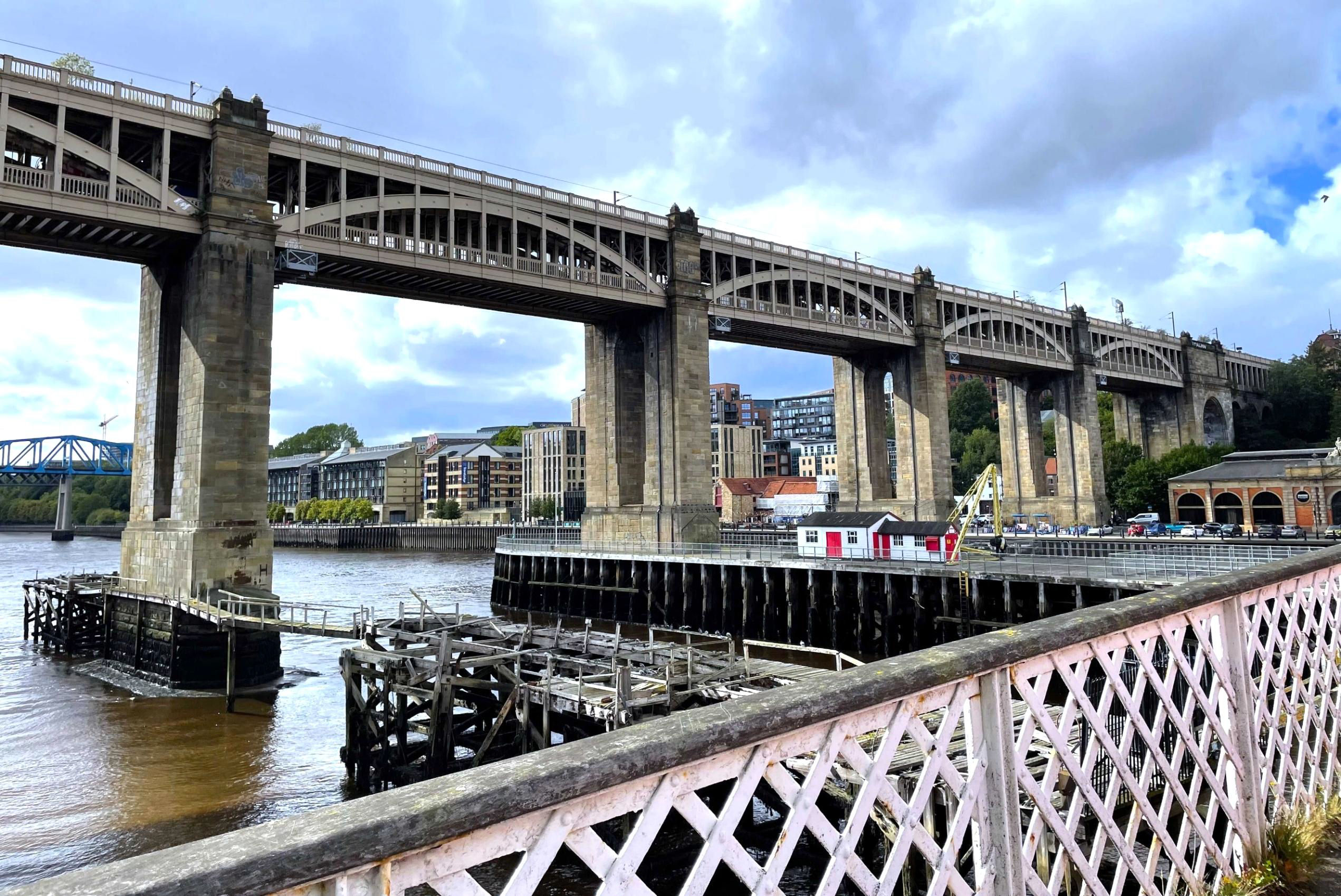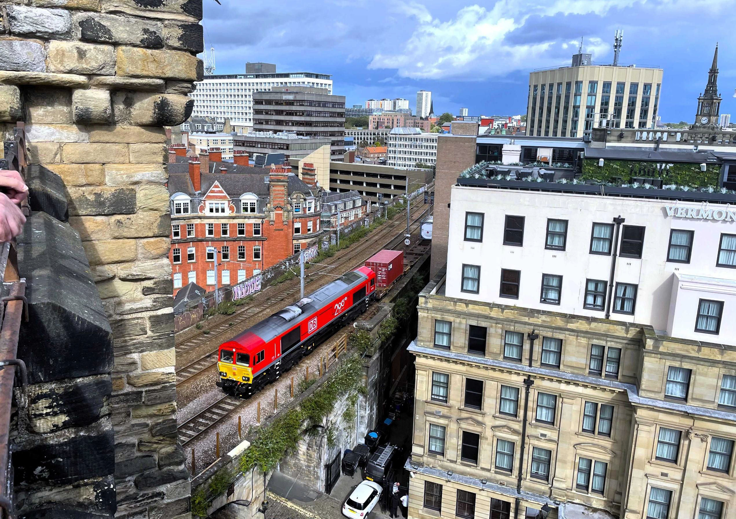 Next, Adam took us down Westgate Rd to the Black Gate to buy an entrance ticket to Newcastle Keep for the traditional view, to the west, of Newcastle station from its roof, once with a complex of bespoke diamond crossings We started the climb up the Keep, finding a splendid 'lunch space' and a welcome break to sit down and demolish lunch before venturing on up the Keep's spiral staircase. Soon after we had enjoyed sandwiches and crisps, we reached the top, with blue skies and fluffy clouds to watch trains in and out of Newcastle and also enjoy views across the High Level Bridge (1849), our next point of call.