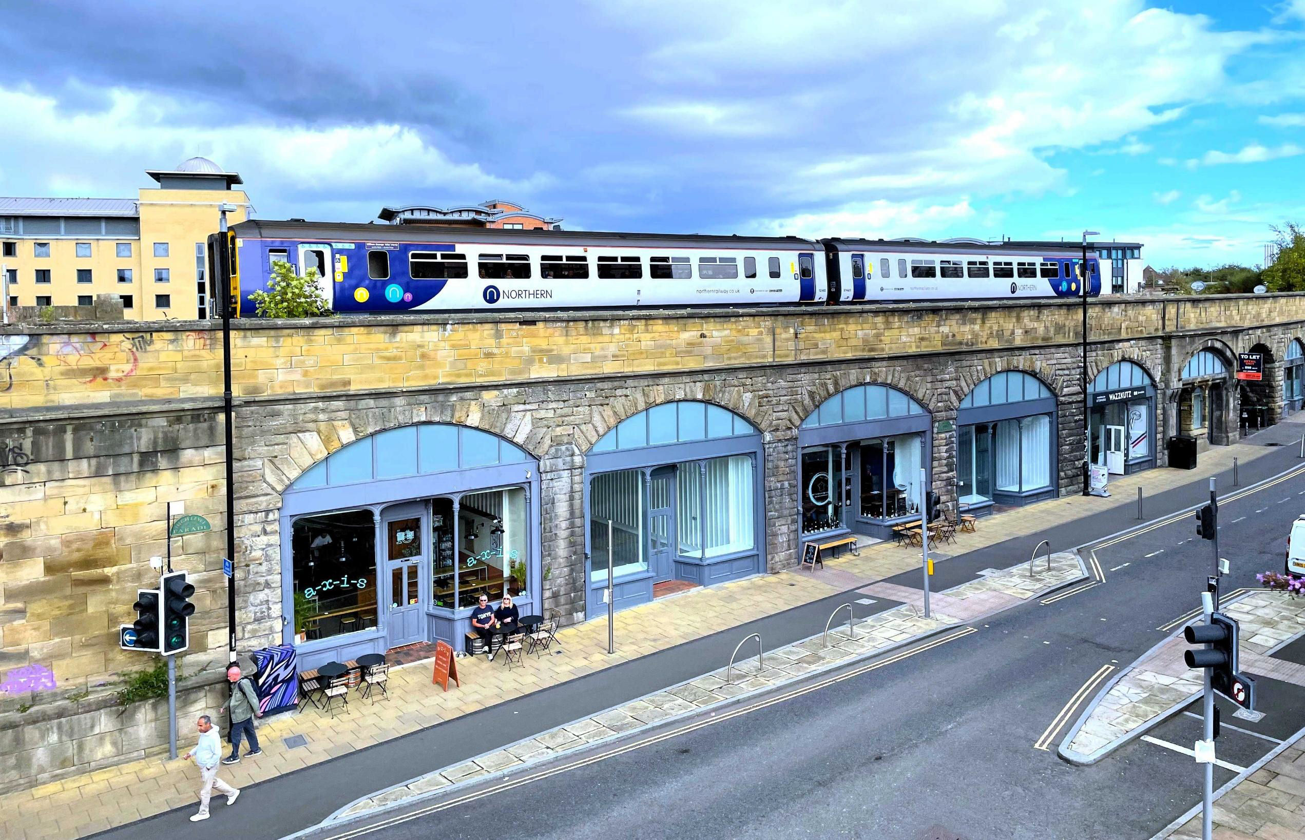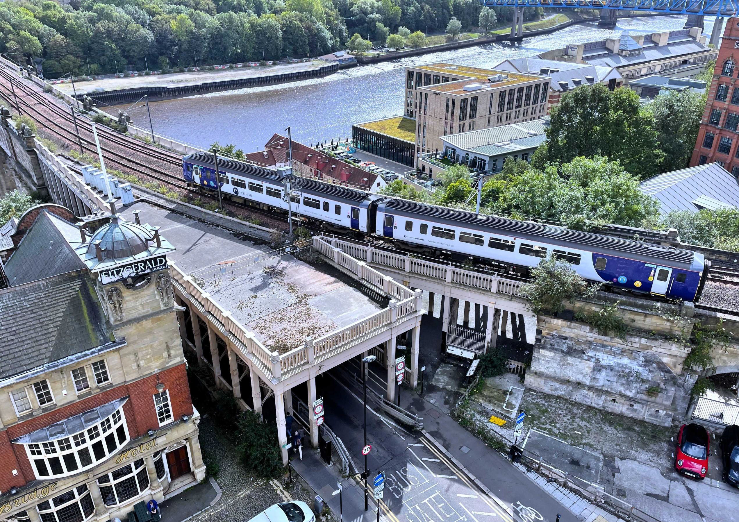 From the site of Gateshead West station. A DMU on the arches where Gateshead East station was - the entrance was near the right end of these arches.