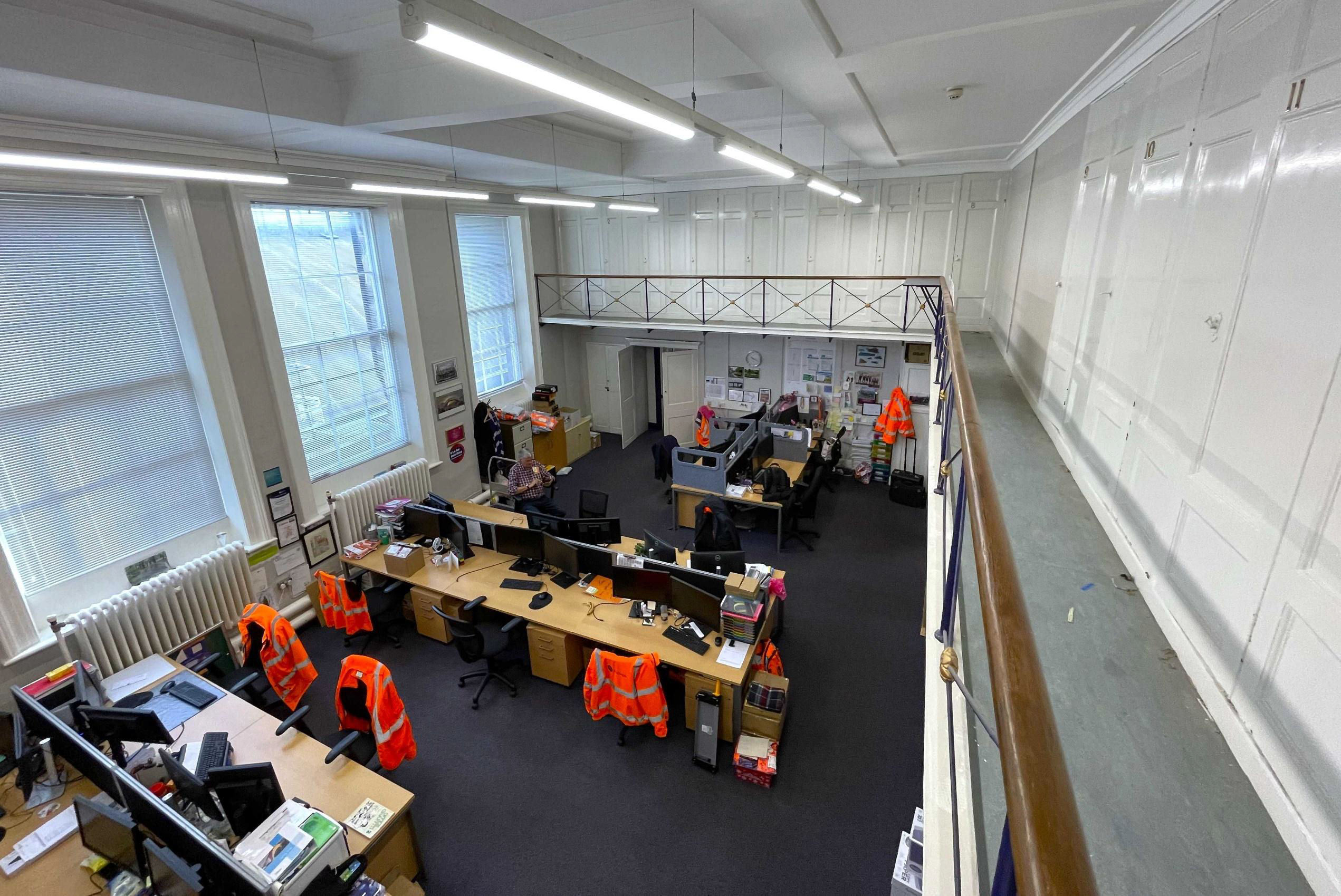 Our group made its way to the front of the station via the Orchard St taxi subway and the Royal Station Hotel vehicle entrance - seeing the Art Deco style rear entrance of the hotel on the way. We entered the portico once more, where we met our friendly host from Northern Trains. He took us up through nondescript staircases into the railway offices above, to visit the original galleried offices now used by Northern. Our host showed us up via narrow staircases to reach the gallery levels, used for storage, the double height of the room in combination with large windows and a now-infilled central skylight helping to light the room naturally. He said that the offices were notorious for being boiling hot in the summer and cold in the winter, that I remember London Underground staff saying of working at 55 Broadway!