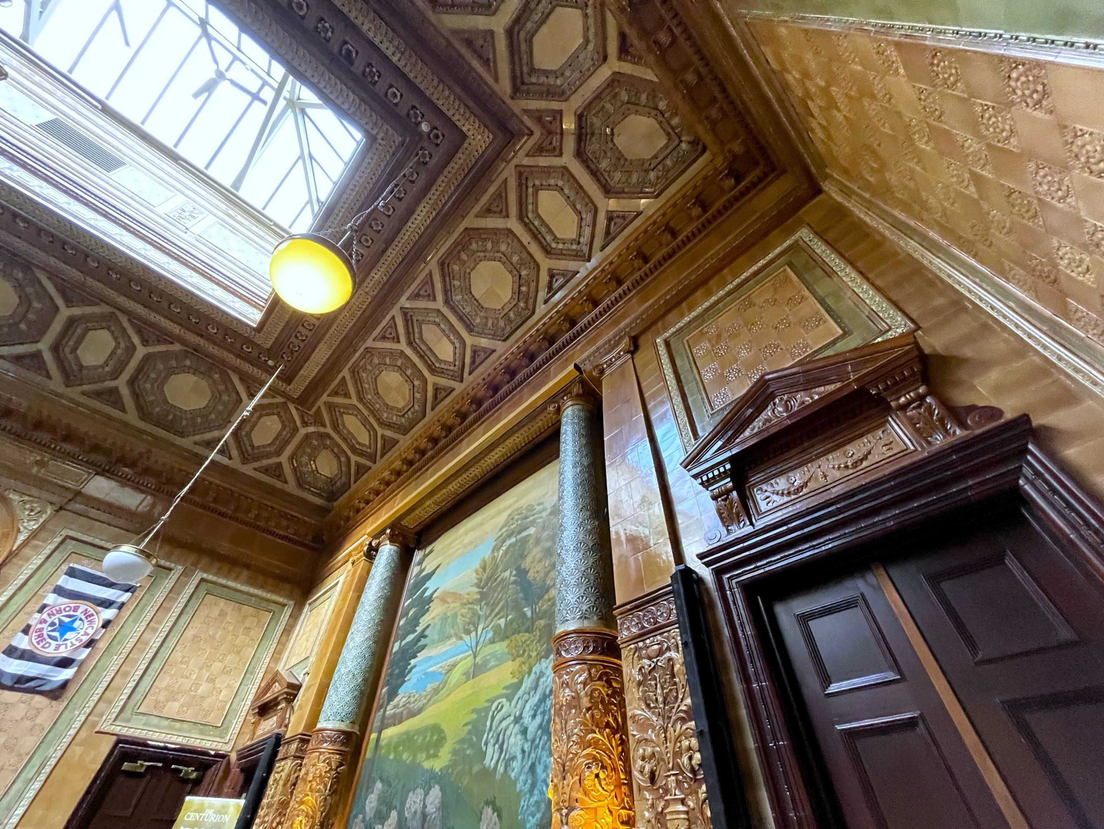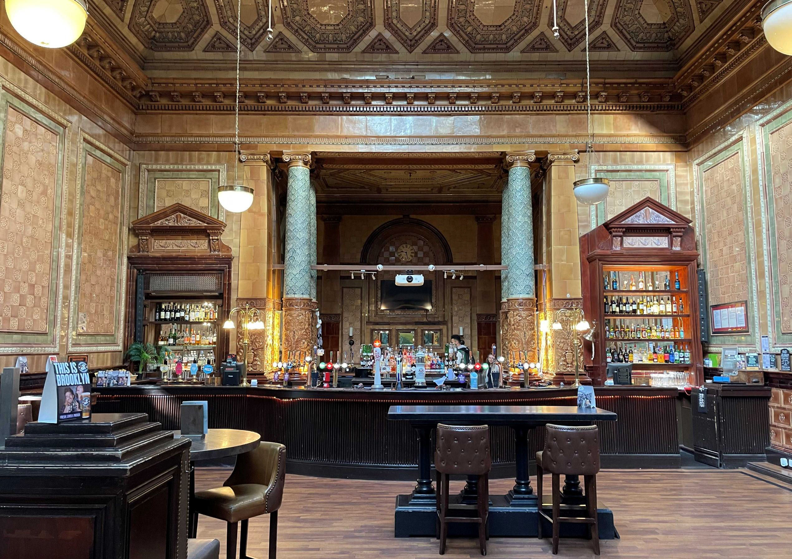 The Centurion Bar pilasters, coved ceiling, and (in an 1893 refurbishment) Burmantofts faience tiles.